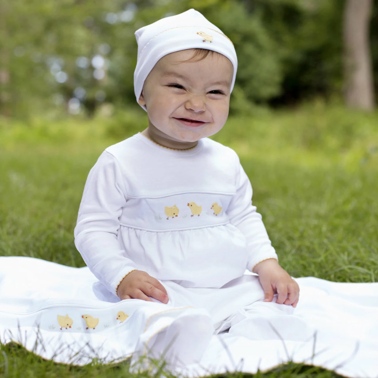 Are you in love with our Baby Chick pima set, and looking for the perfect accessory? Check out this adorable baby blanket, made out of soft pima cotton that is oh so gentle on Baby’s skin. This sweet accessory has a panel inset on the solid white background featuring the cute little hand embroidered chicks this set is known for. Be sure to buy the matching romper, gown, hat, and bib from this set as well!