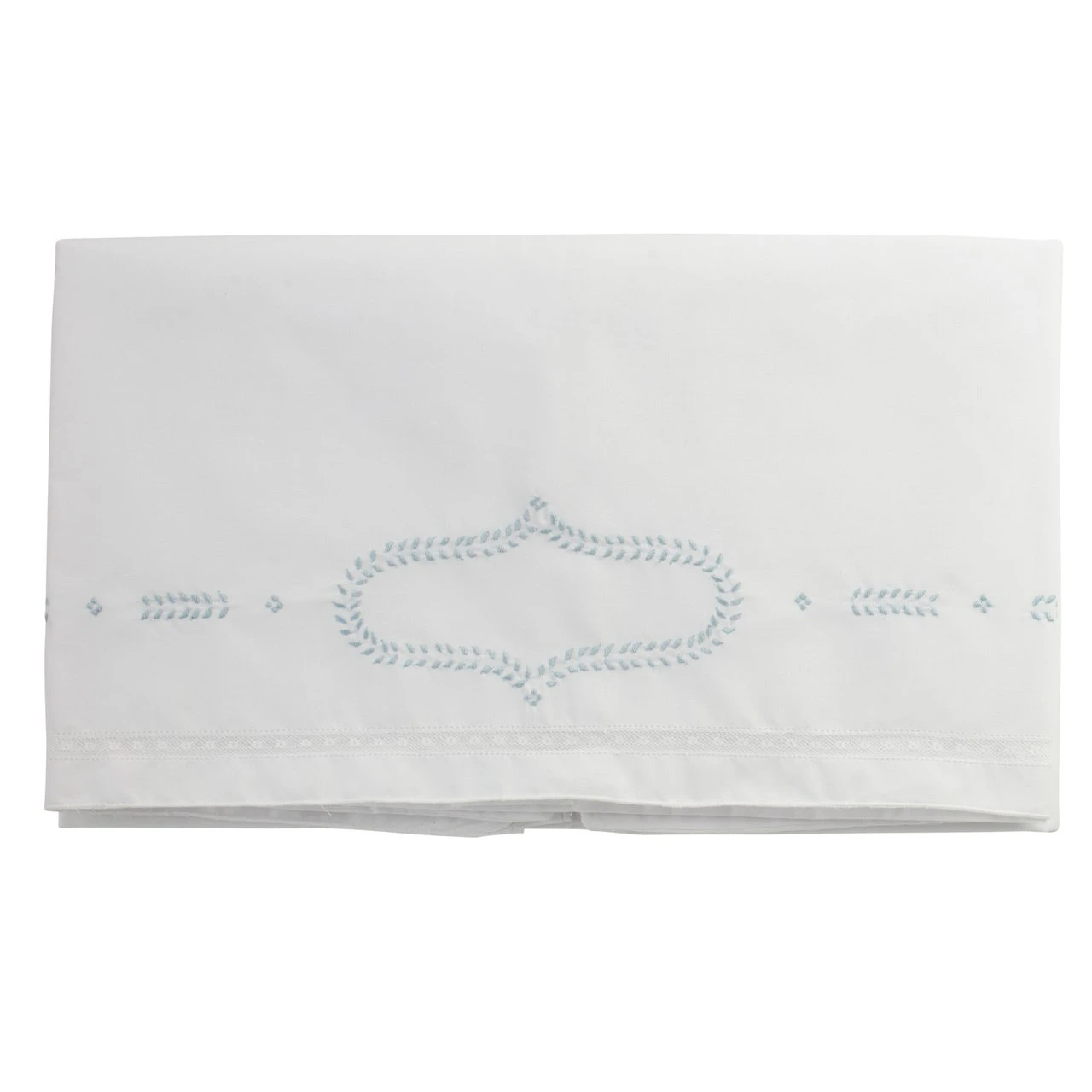 The blanket is made of soft white, with baby blue leaf-and-dot embroidery and classy French lace at the edges. The embroidery on this piece is all hand-done, because we believe in producing only the highest quality for your family that we know will last for years to come.