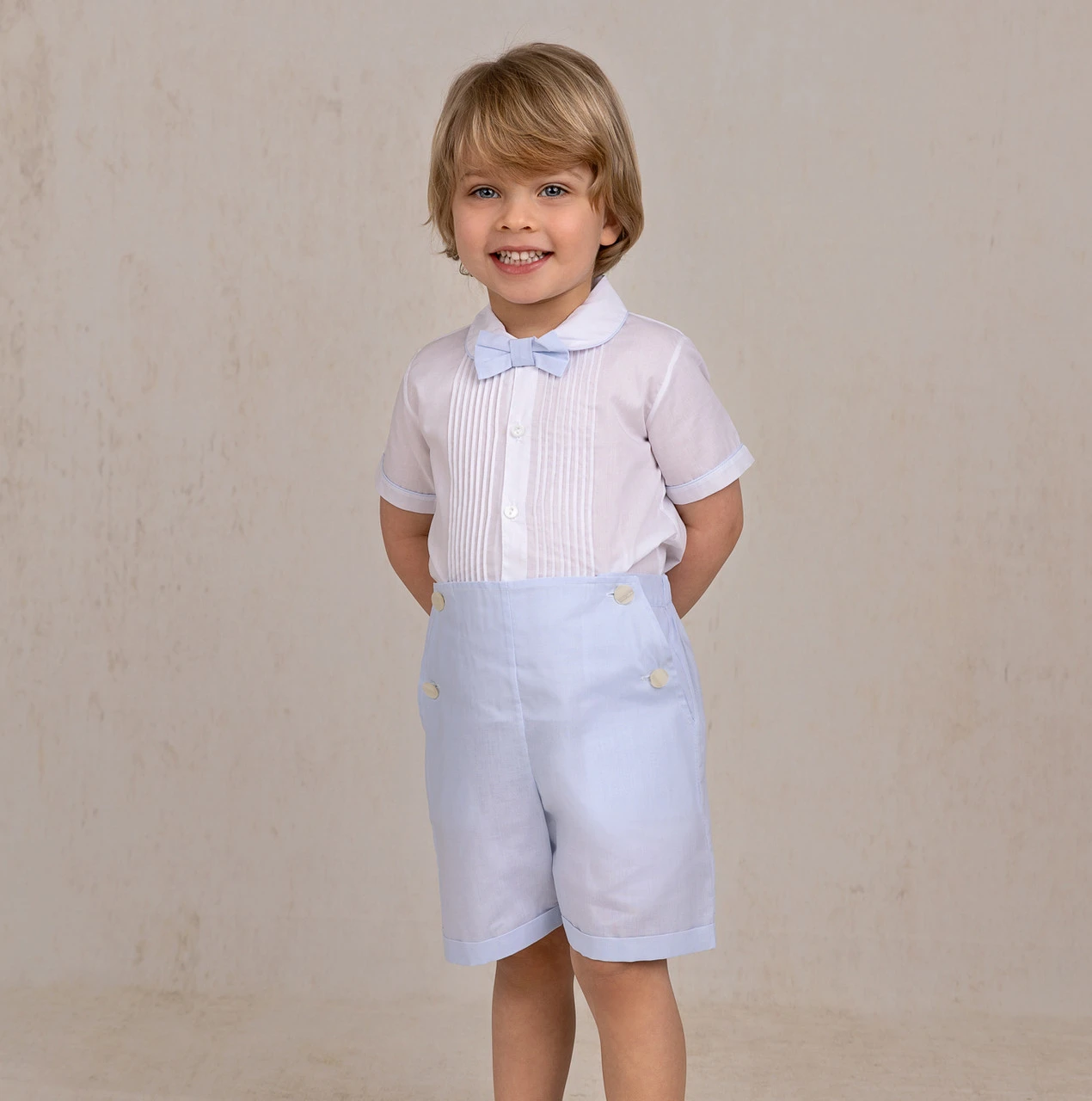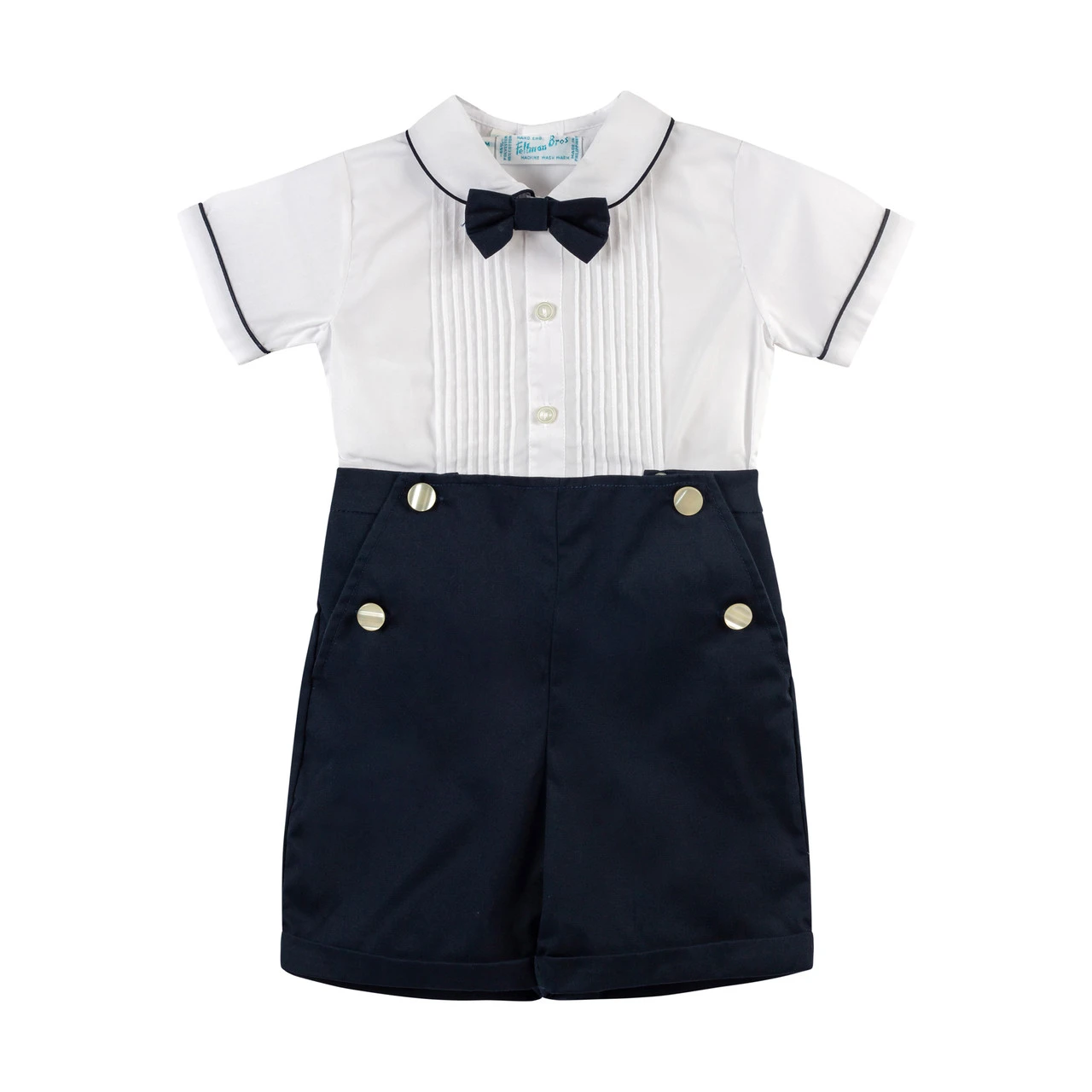 This Bobby Suit is sure to become a treasured family heirloom! Designed with a timeless “tuxedo” style, including a bow tie, hand-stitched pintucks, and button-close pockets on the pants. Fall in love with this vintage-inspired outfit, beautiful for Easter, weddings, and family portraits.
