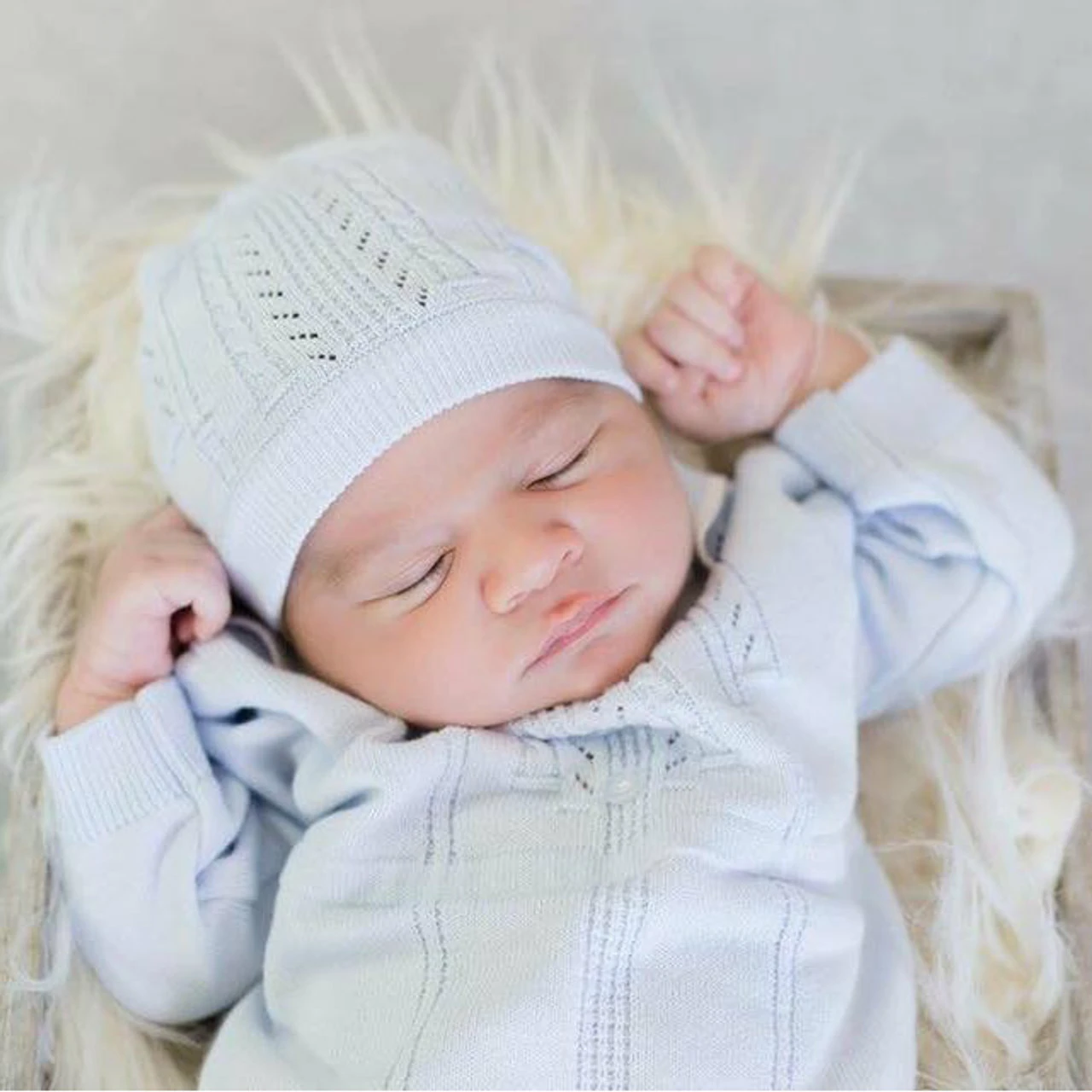 A classy knit set designed with your baby boy in mind! The Collar Knit Longall is available in soft blue or white colors, with a pointed collar and ribbed edges at the sleeve and leg cuffs. The front is embellished with cable and pointelle knit details as well as petite buttons in the center. Includes a matching hat to keep Baby warm and complete the look. A beautiful heirloom set for your prince!