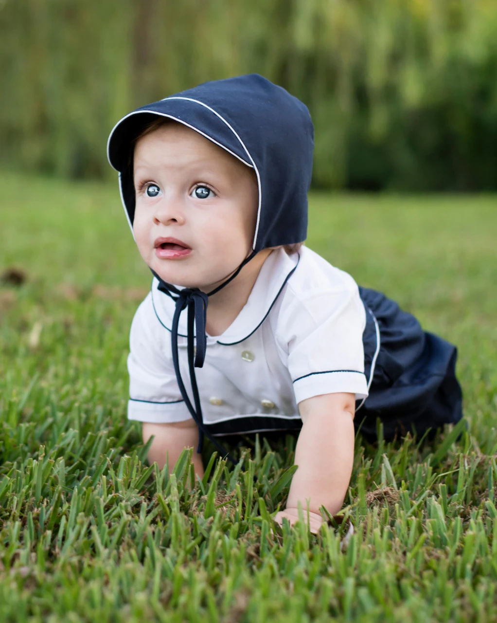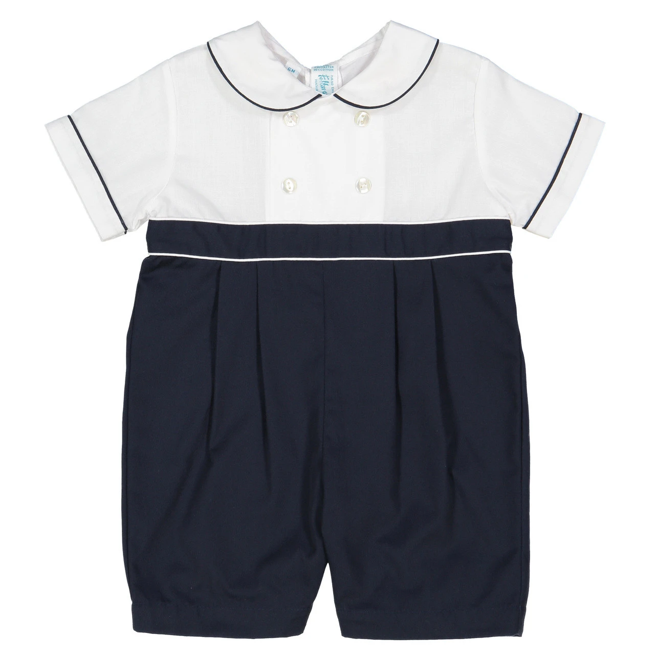 Meet our new Double Breasted Collection – another timeless, vintage look from Feltman Brothers! This baby boys romper features that classy double breasted look, along with dainty piping on the peter pan collar and sleeve cuffs. Gathered pleats go down the pants – available in navy or baby blue. Works great as a Sunday outfit, for formal occasions, or for family pictures! Make sure to check out the rest of the new collection, our Double Breasted Dress, Bobby Suit, and Girls Romper. It’s doesn’t get much classier than this!