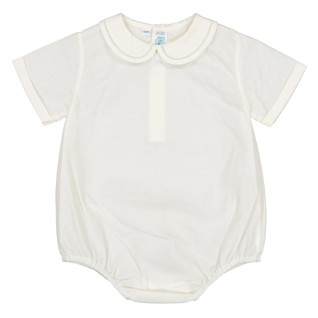 Feltman Brothers is known for combining vintage style with timeless, heirloom quality, and this piece does not disappoint! This elegant Onesie Shirt is a great basic with a classy peter pan collar and faggoting stitching around the edges. Pair with a Feltman Brothers cardigan or suspender set, and he’s good to go!