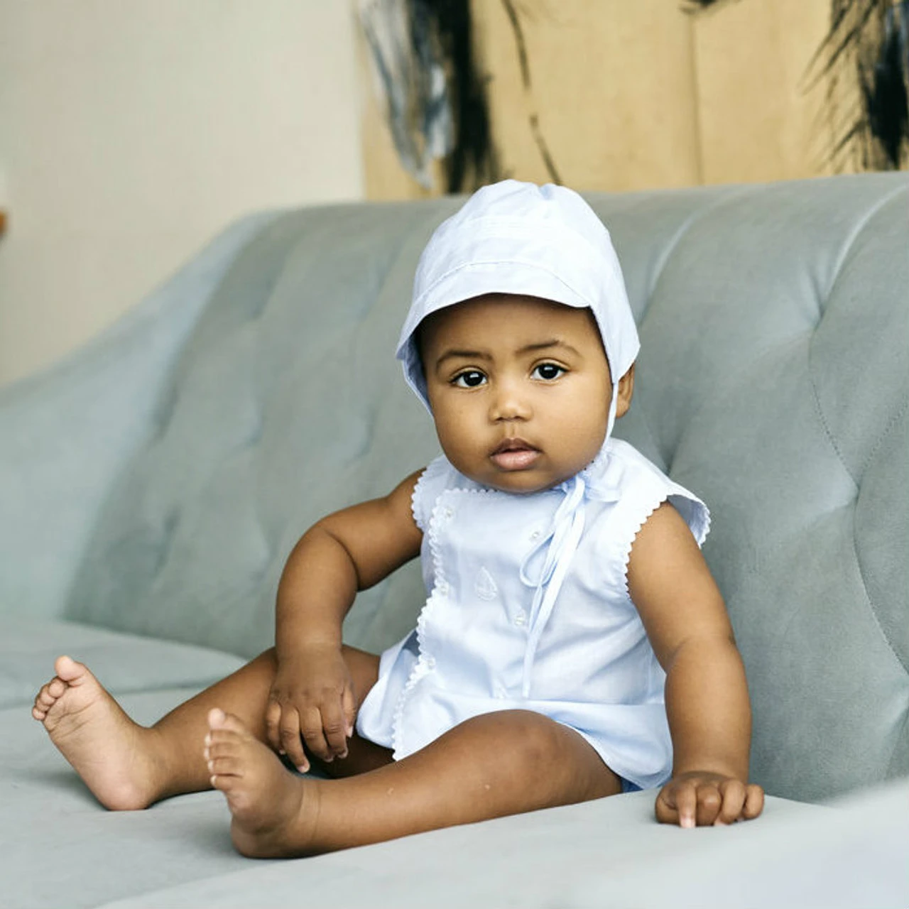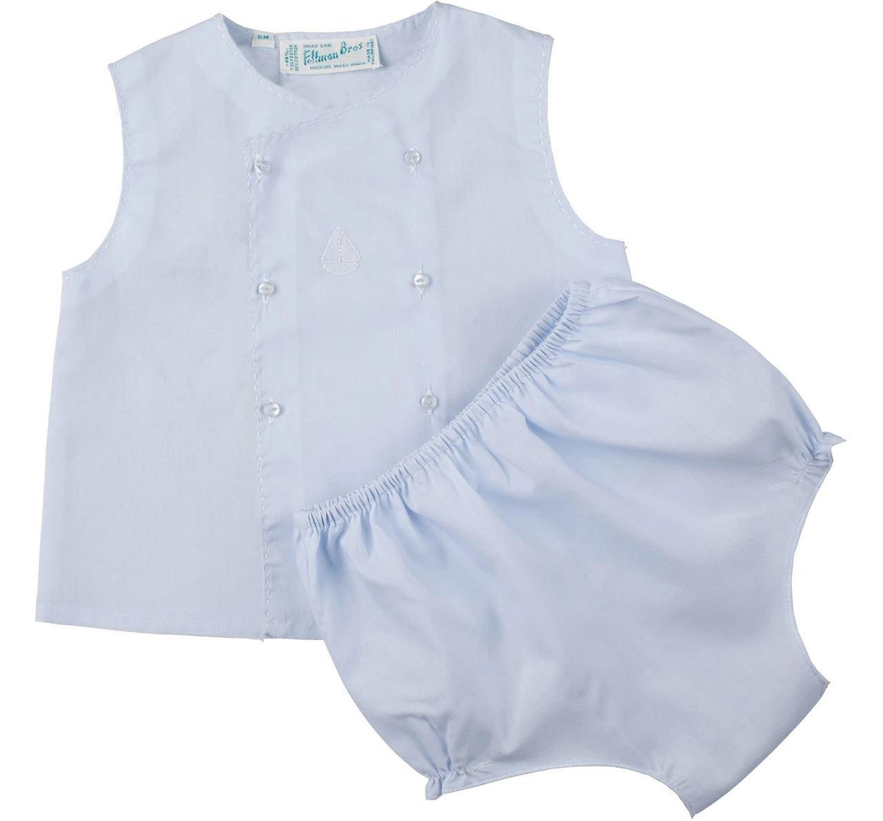 Who doesn’t love sweet, nautical themed baby clothing? This adorable and classy diaper set is just right for your little boy! Features blue and white contrasting colors, with stitching at the edges and a shadow stitch embroidered sail boat in the middle. Two rows of sweet mother of pearl buttons go down the front for a classy, understated look. An eye catching diaper set for your loved one, made with the heirloom quality you’ve come to expect from Feltman Brothers.
