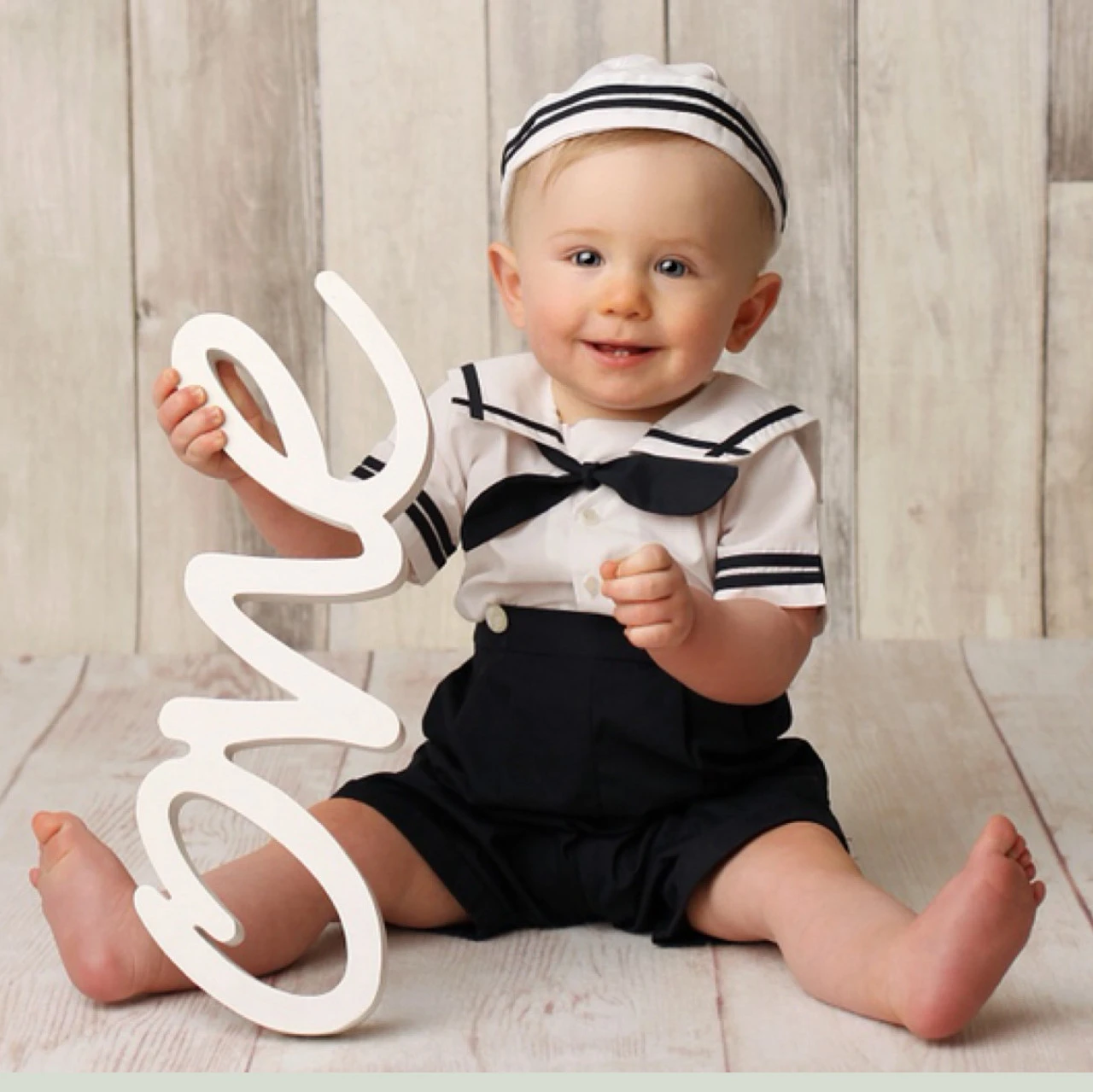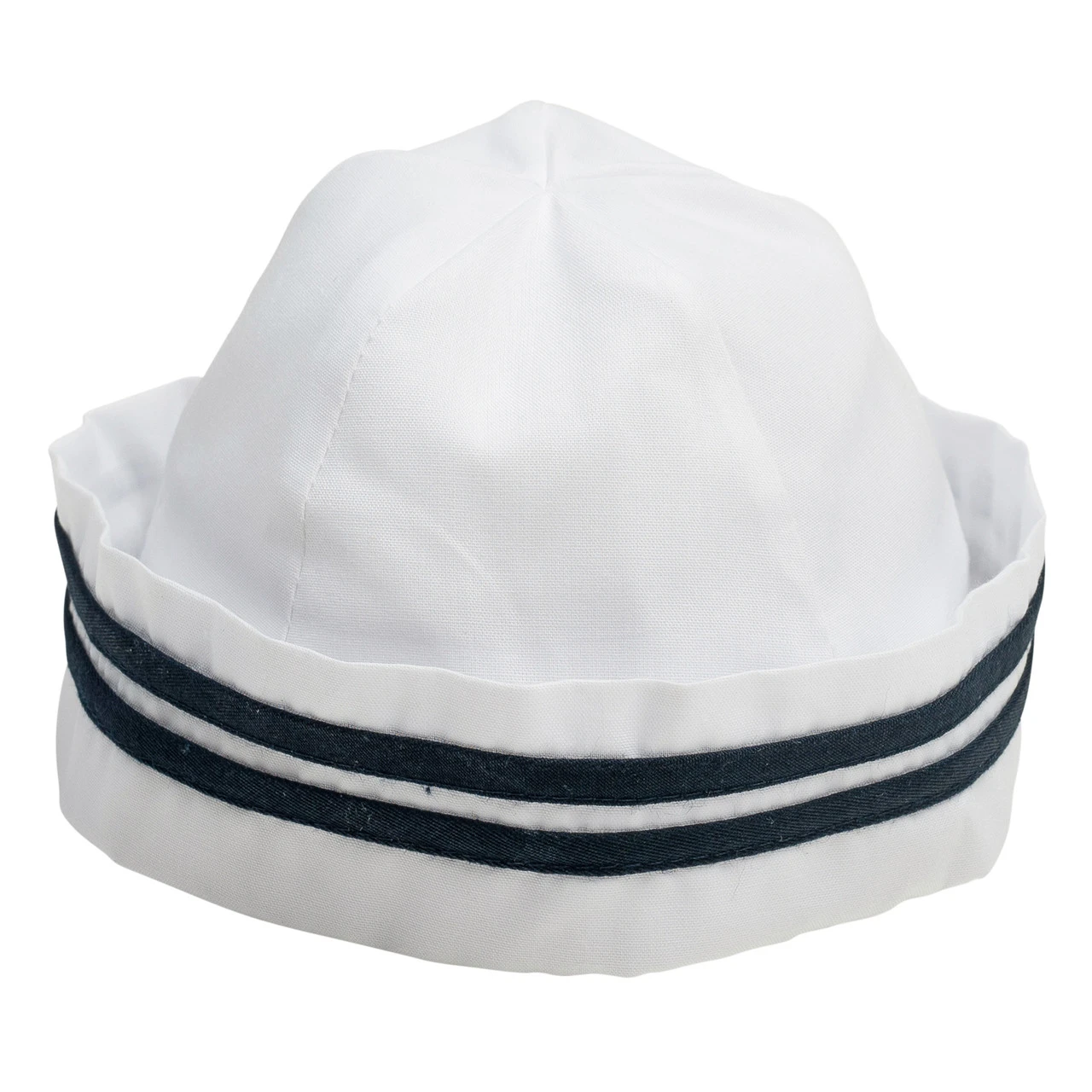 What’s a sailor without a sailor hat? The perfect accessory to go with our Sailor Creeper or Sailor Bobby Suit to give your little boy’s outfit the finishing touch! Double binding lines the brim of this sailor hat, and two strings to fasten it to your little guy’s head hang down from the sides. Available in Navy or Baby Blue to match whichever outfit you chose, this sailor hat will turn any mini man into a mini sailor! Please note that this hat does run small. We recommend purchasing one size up.Â