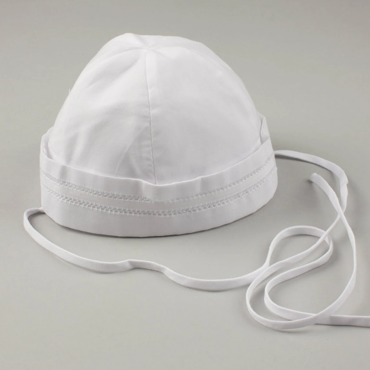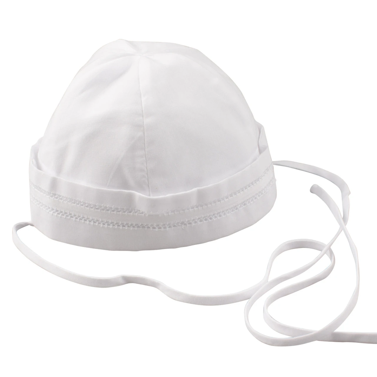 Who doesn’t love a little sailor boy? In this adorable sailor hat your little one will be ready to ride the waves! Made of solid white with fagoting along the brim and thin ribbons for fastening securely beneath his chin. Match to one of our many sailor and nautical themed outfits, and he’s off to conquer the seas! PLEASE NOTE: This hat does run small. It is recommended to purchase a size up. Â
