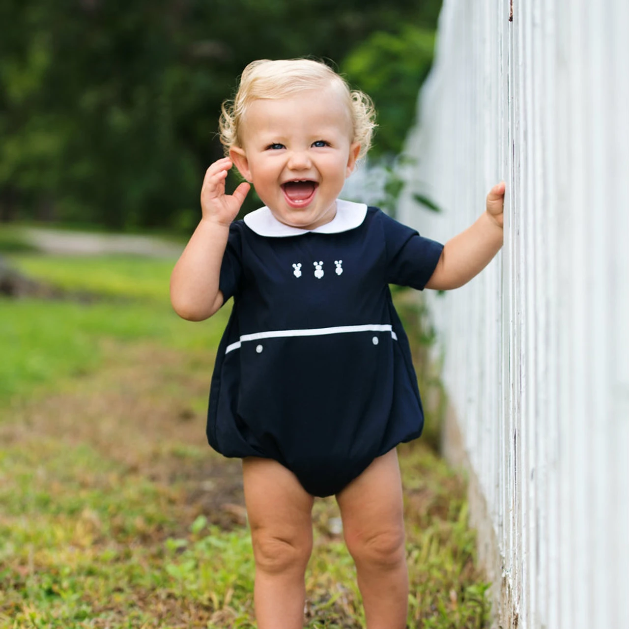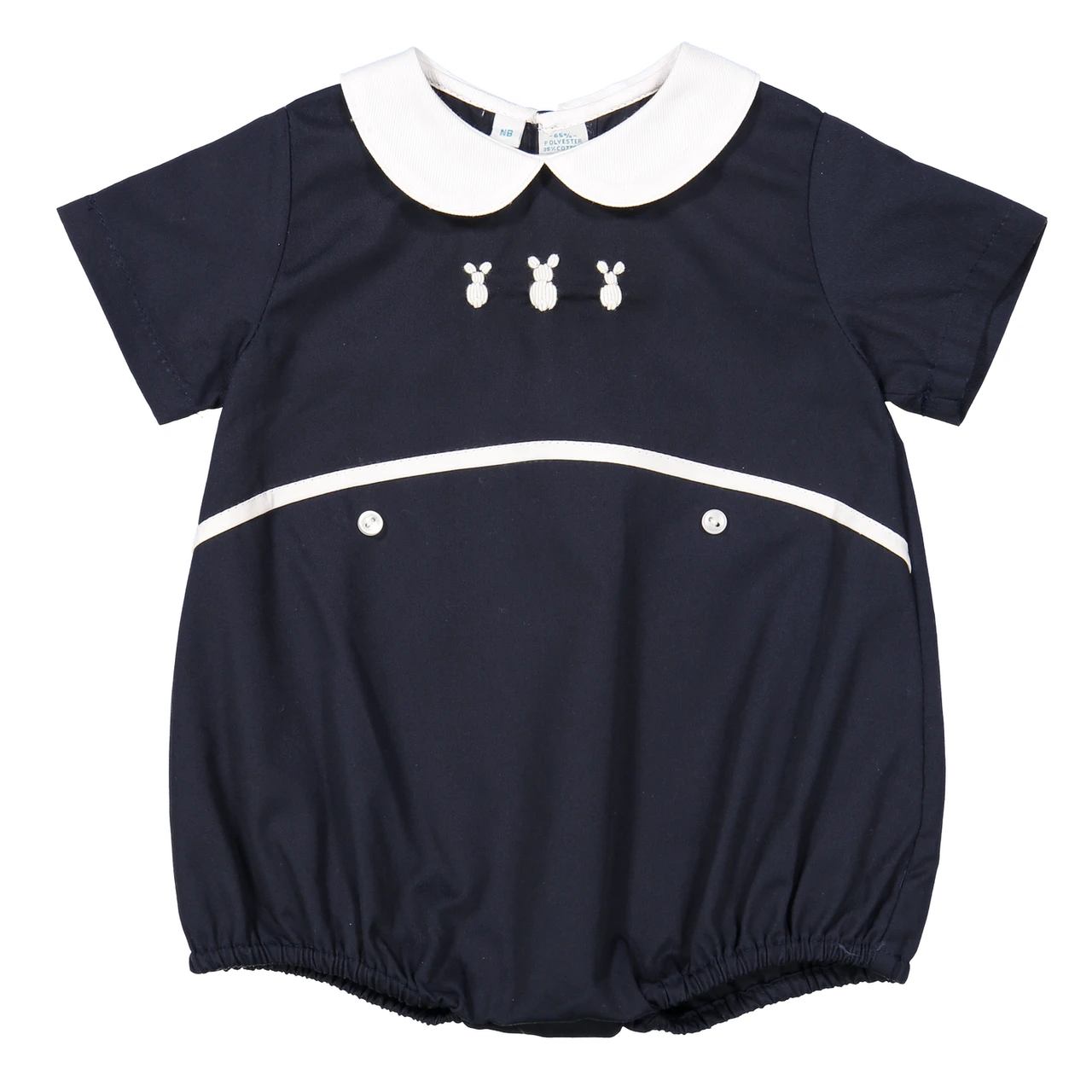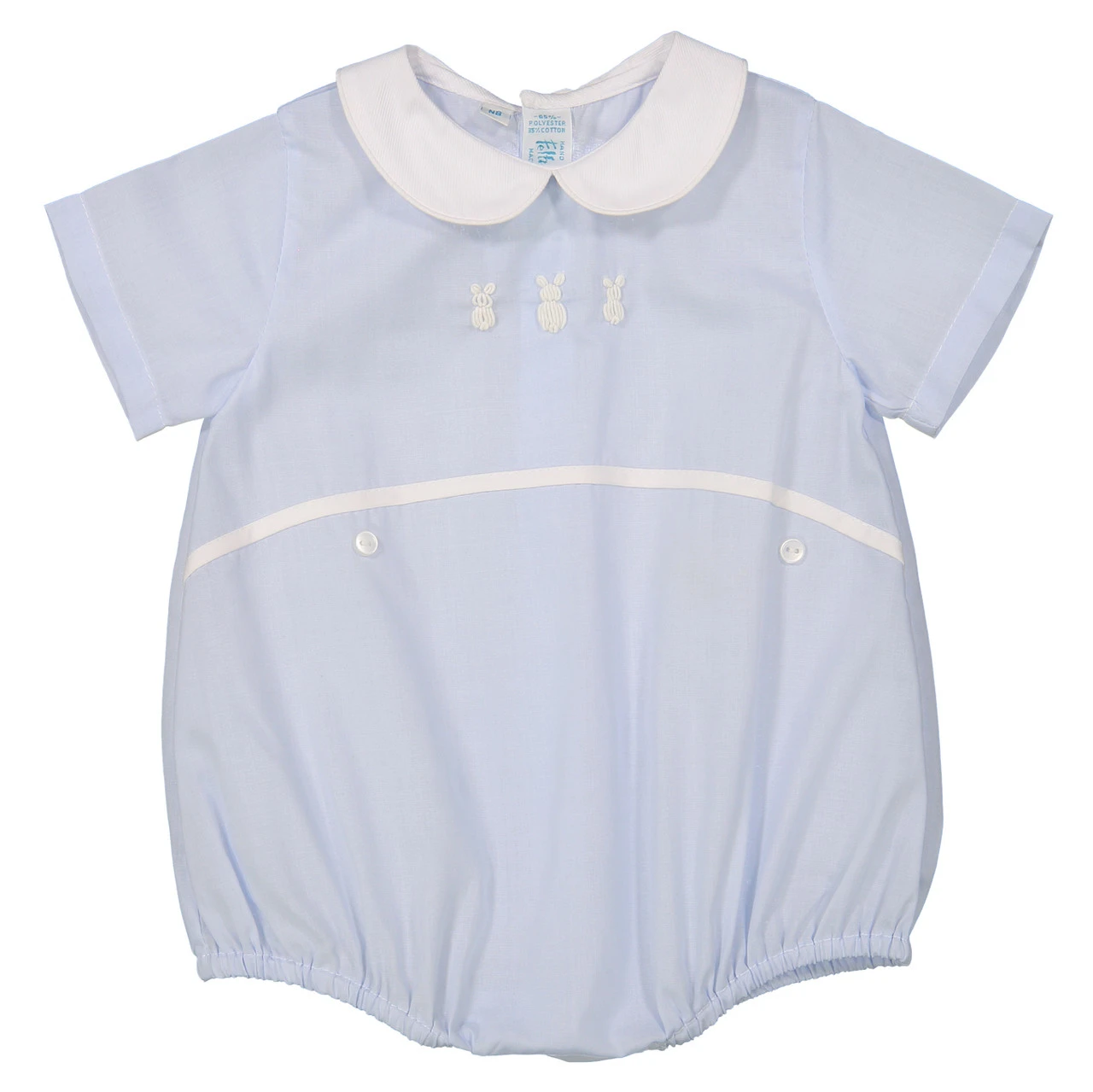 Check out this adorable Bunny Creeper, perfect for your little boy! In this precious little outfit with hand embroidered bunny bullions, your loved one will steal the hearts of all who see him! With a white peter pan color and waist band with buttons right below it, this piece features all the details to make it the special outfit you were looking for. Another outfit true to the Feltman Brothers tradition of heirloom quality coupled with vintage style – sure to please the discerning eye!