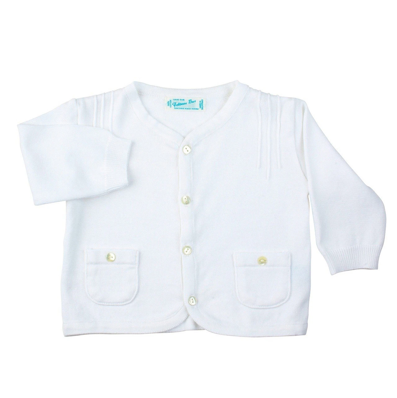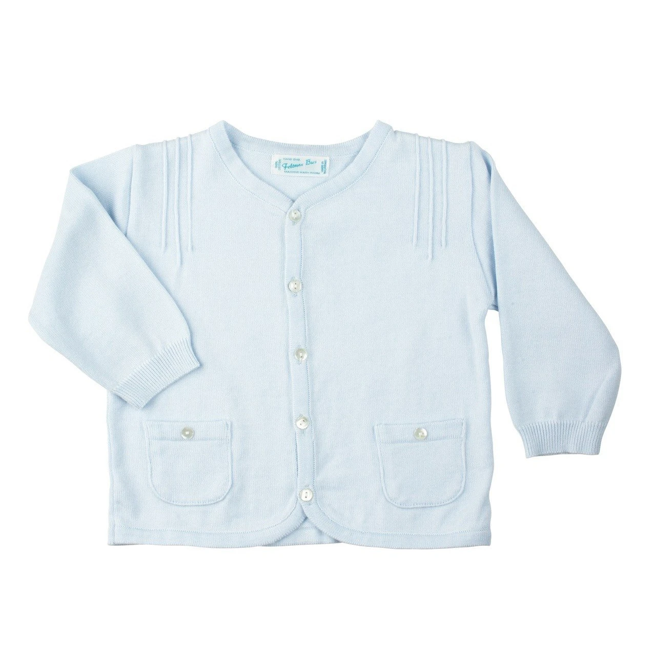 What to do when you want your precious one to stay warm but don’t want to sacrifice on style? Go with a Feltman Brothers Cardigan of course! This Button Pocket Knit stays true to the Feltman Brothers tradition of vintage style, with a contemporary twist. Featuring raised knit lines and tiny classy pockets, this is the ultimate sweater for layering or as beautiful top in its own right. Available in baby blue and white to match every outfit he owns!