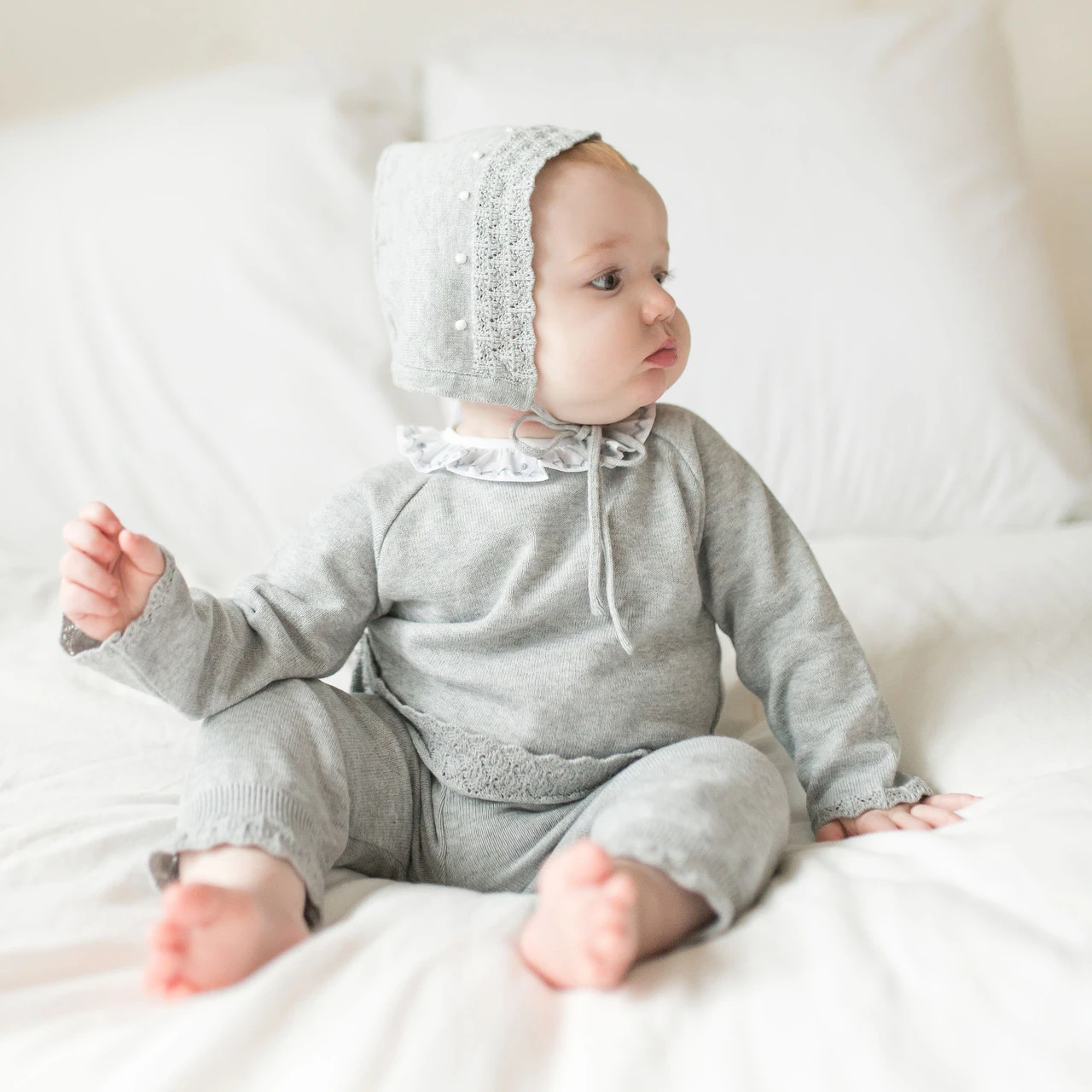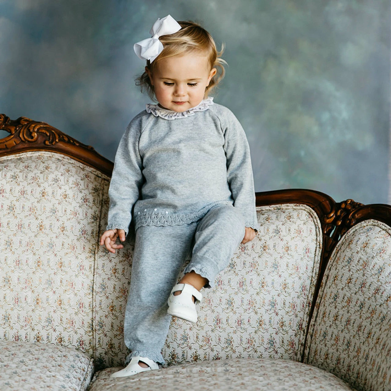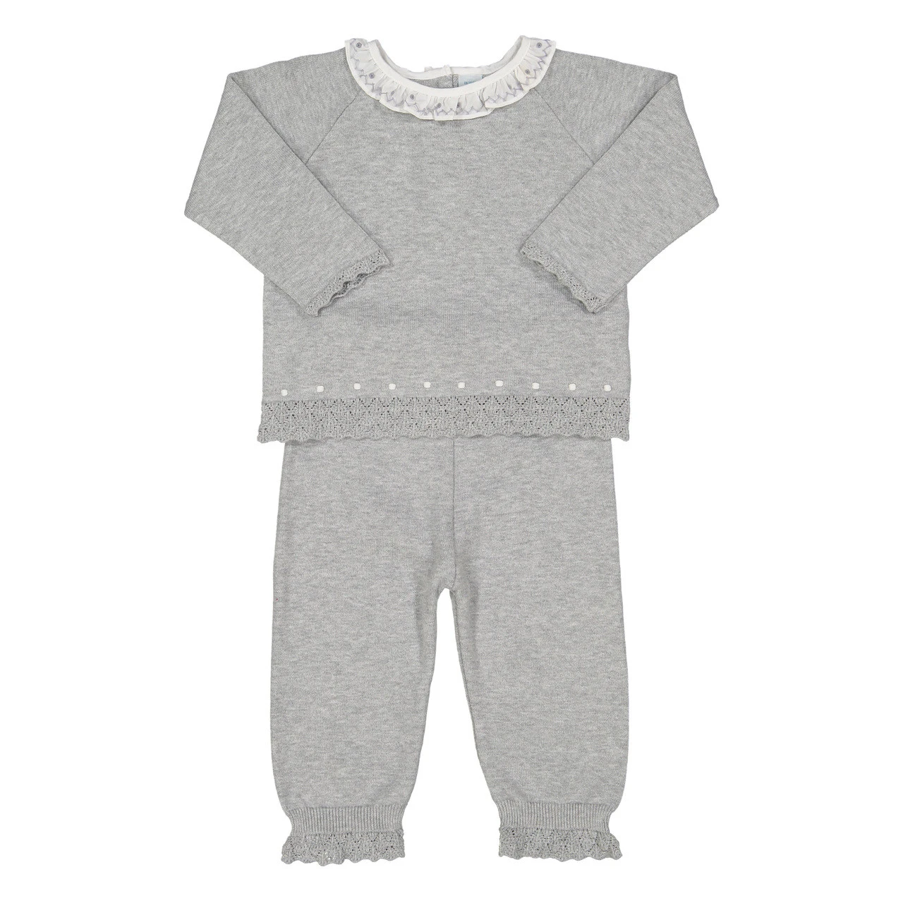 Want your baby girl to stay warm this winter while still looking cute-as-can-be? Check out this adorable knit set from Feltman Brothers! This classy and cozy 2-piece set features the most beautiful diamond pointelle at the edges, along with a sweet embroidered dot design. Plus, it’s got a white ruffle collar with hand embroidery that will just melt your heart. Grab the matching Dot Knit Bonnet and she’ll be good to go! (And we’ve even got a matching set for boys, our new Pique Collar Dot Knit Set!)Â (Closed feet in sizes Newborn – 9 months.)