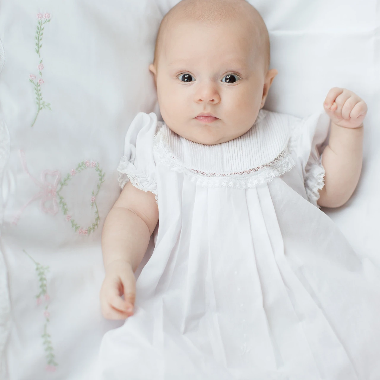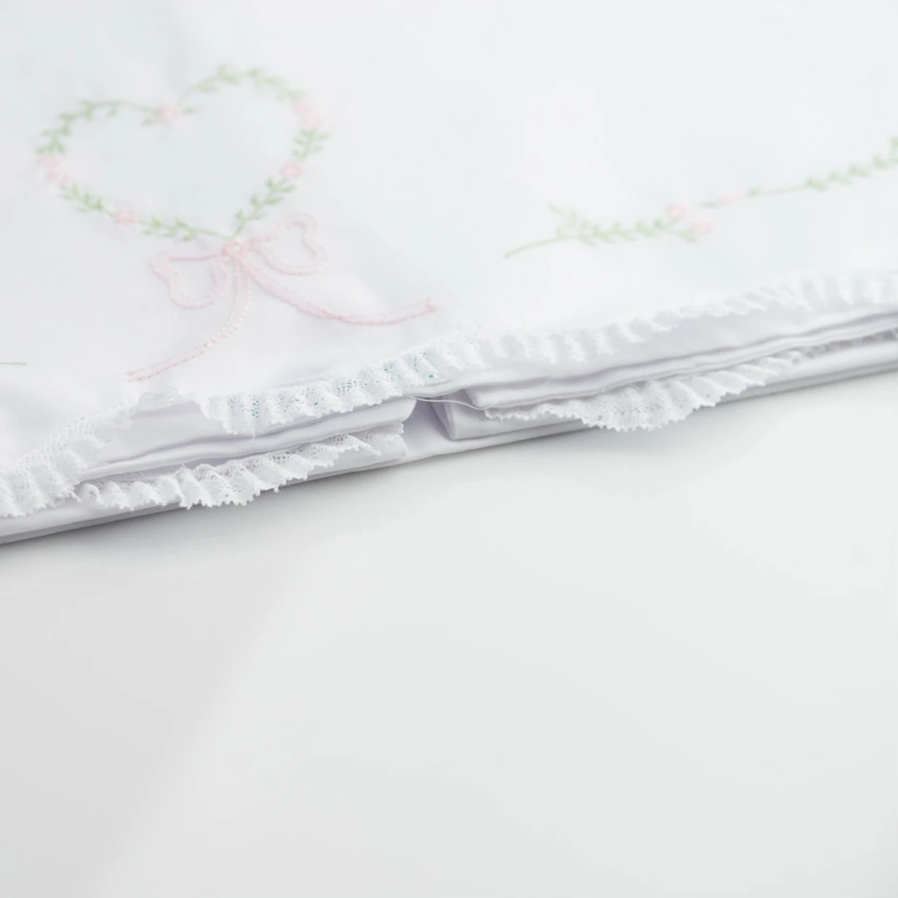 An absolutely precious accessory for your little one! This baby girls receiving blanket is the perfect match to many Feltman Brother layette pieces, with its soft white color and elegant style. It features an intricate hand embroidered floral wreath shaped like a heart, ending in a sweet shadow stitch bow at the bottom. Fluted lace in a scalloped design trims the borders of this dainty little girl accessory. And the best part? It even has a matching pillow case!