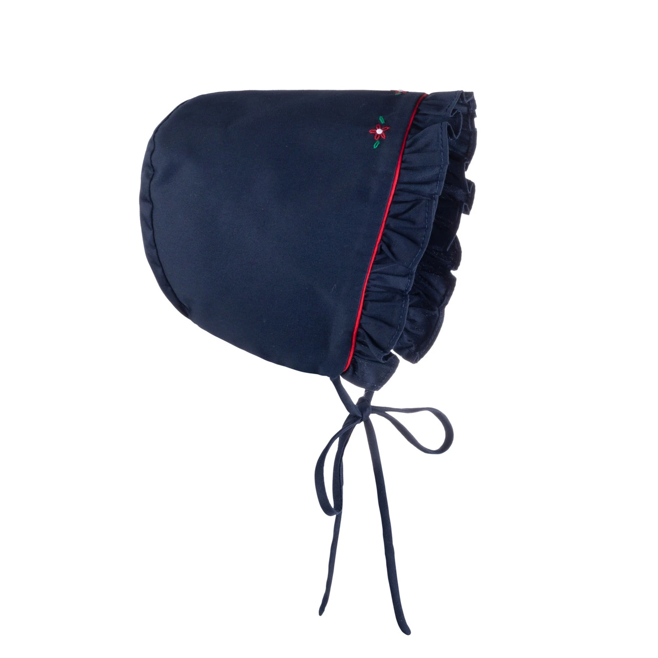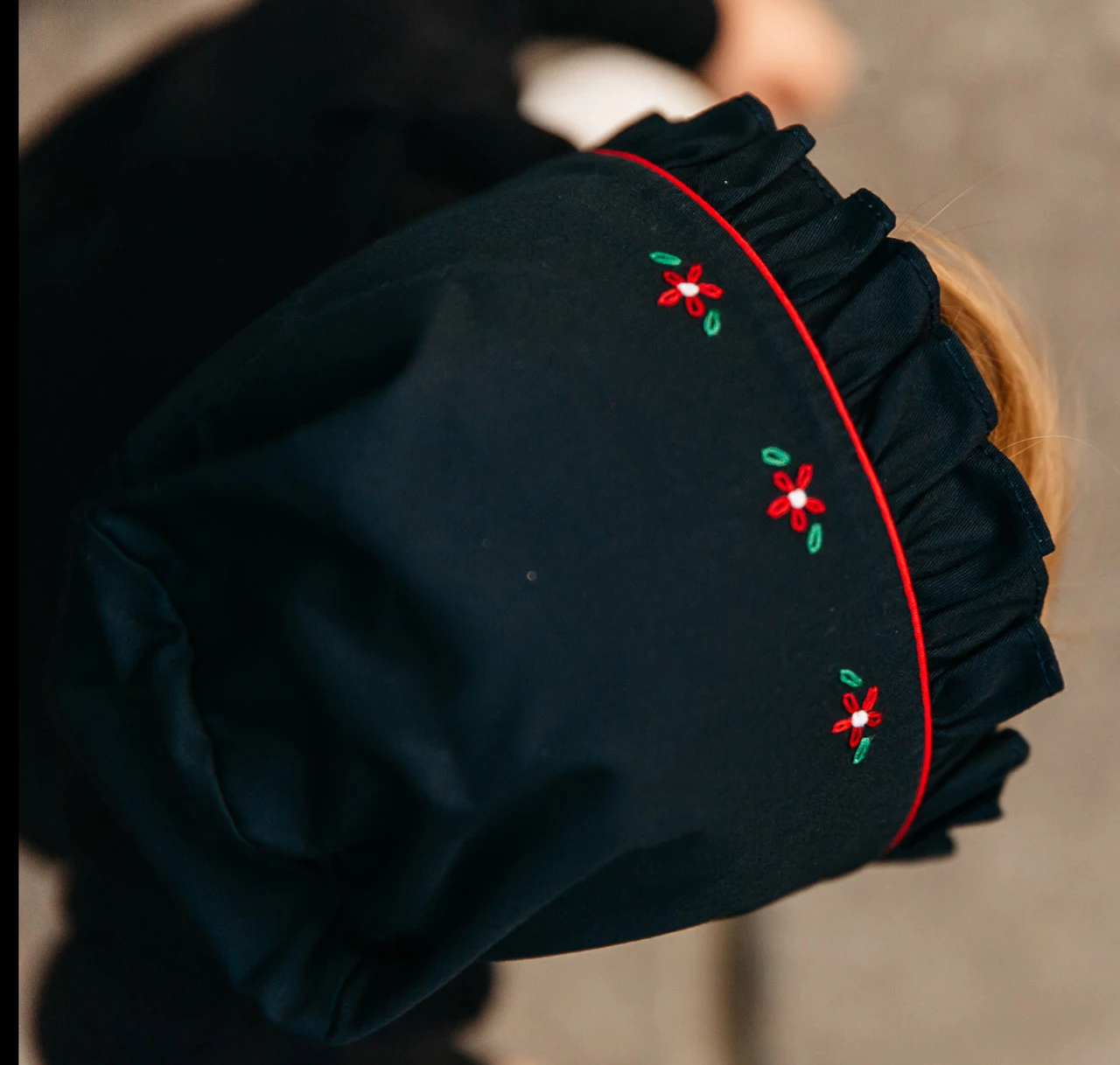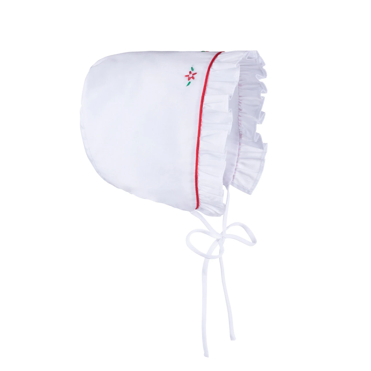 The sweetest addition to your baby girl’s holiday wardrobe! This timeless holiday bonnet features darling ruffles and hand embroidered flowers in the traditional holiday colors. Matches any Feltman Brothers holiday outfit!
