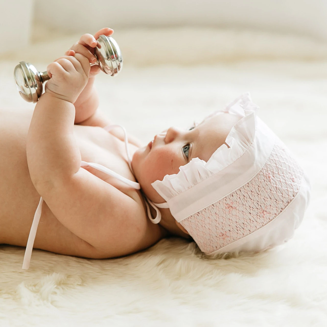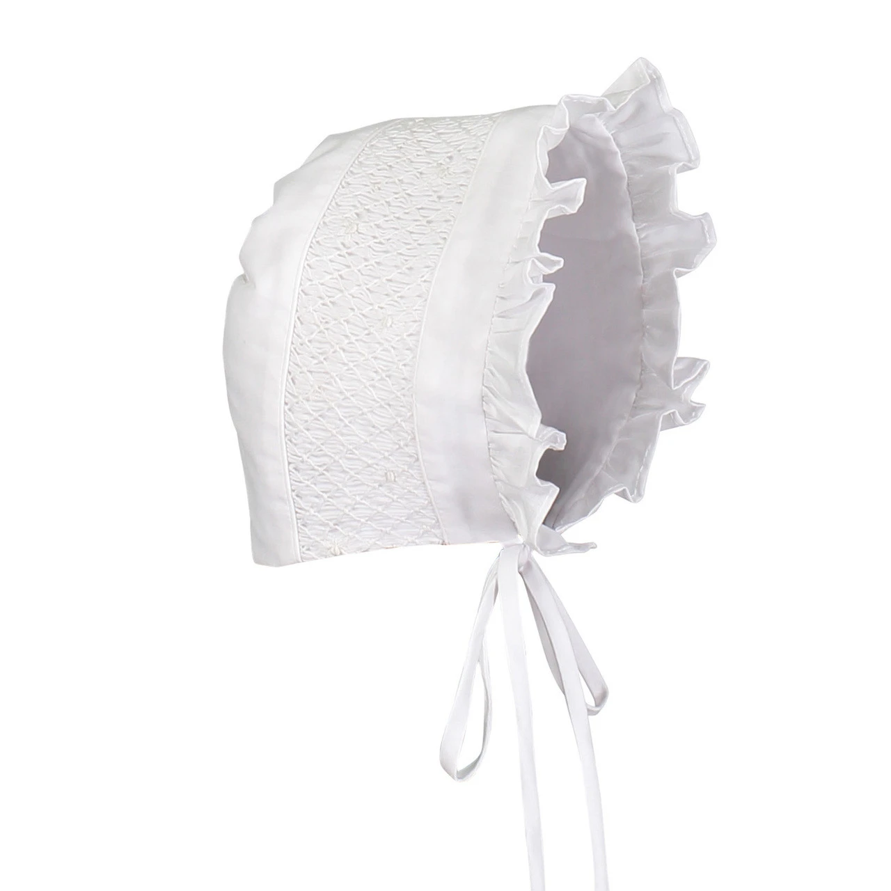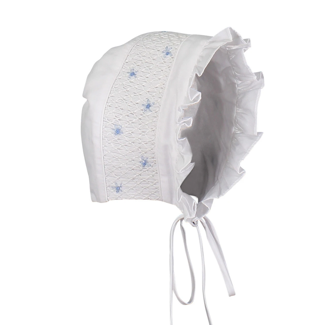Check it out! This has got to be one of our most versatile girls bonnets – available in four different color options, to match every Feltman Brothers outfit she owns! This winner features hand-made smocking with embroidered flowers, ruffled edges, and hanging ribbons for beneath-the-chin fastening. Who can resist a baby girl in a bonnet?!
