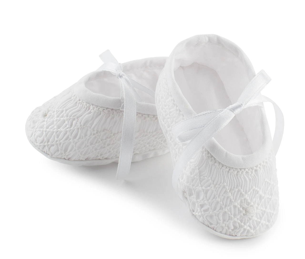 Such precious little girl booties! These adorable and classy baby booties are available in either pink or white, to match just about everything she wears. They are made of beautiful hand made smocking featuring diamond shaped embroidery and a tiny little flower bullion at the front. Dainty ribbons tie on top in a sweet bow to fasten the booties to your little one’s tiny feet. A pair of baby booties so sweet, they’re sure to capture your heart and the hearts of all who see your little princess in them!