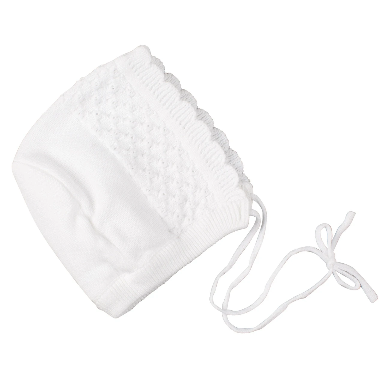 We believe in special accessories for special occasions, and this baby girl bonnet certainly fits the bill! This knit special occasion bonnet features a classy pointelle design with sweet scalloped edges. Fastens just below the chin with two dainty strings for convenience and class. Just the right thing to finish off any special occasion set from Feltman Brothers – sure to make your loved one shine on her special day!