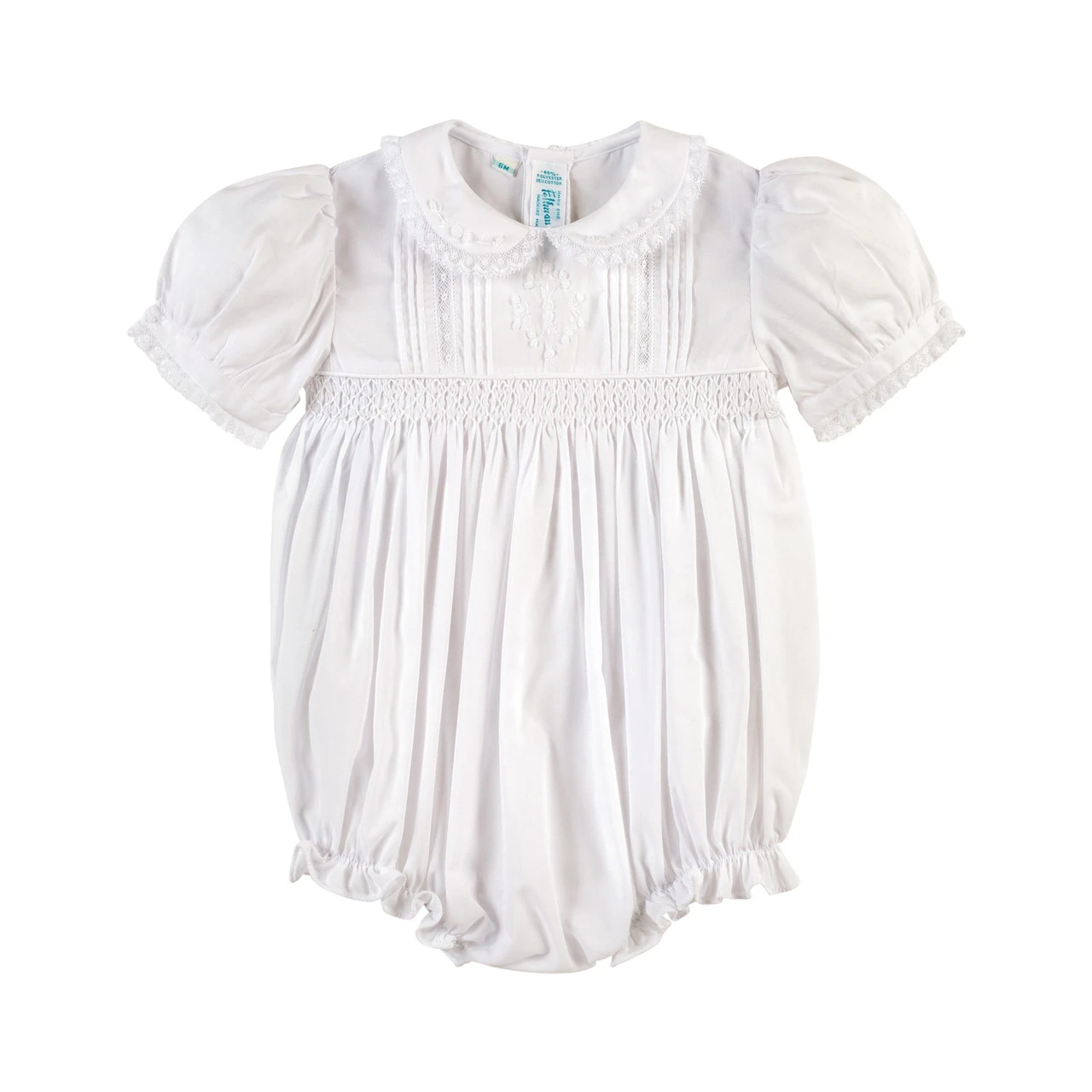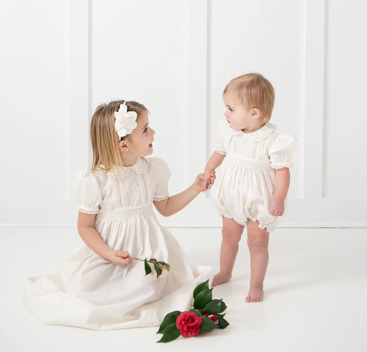 Do you need something for your baby girl to wear to a wedding coming up? This vintage-inspired romper is just the thing! Available in classic white and ivory colors, and FULL of timeless, elegant details: lace, pintucks, smocking, and hand-stitched embroidery. Coordinates with the Flower Girl Dress (Dress available up to size 8!)
