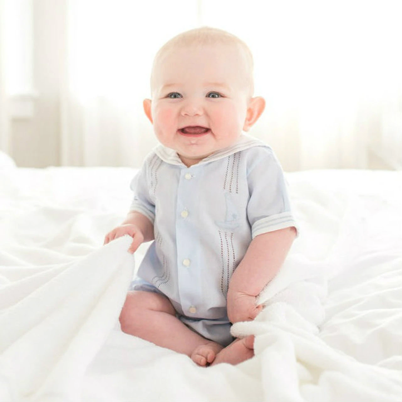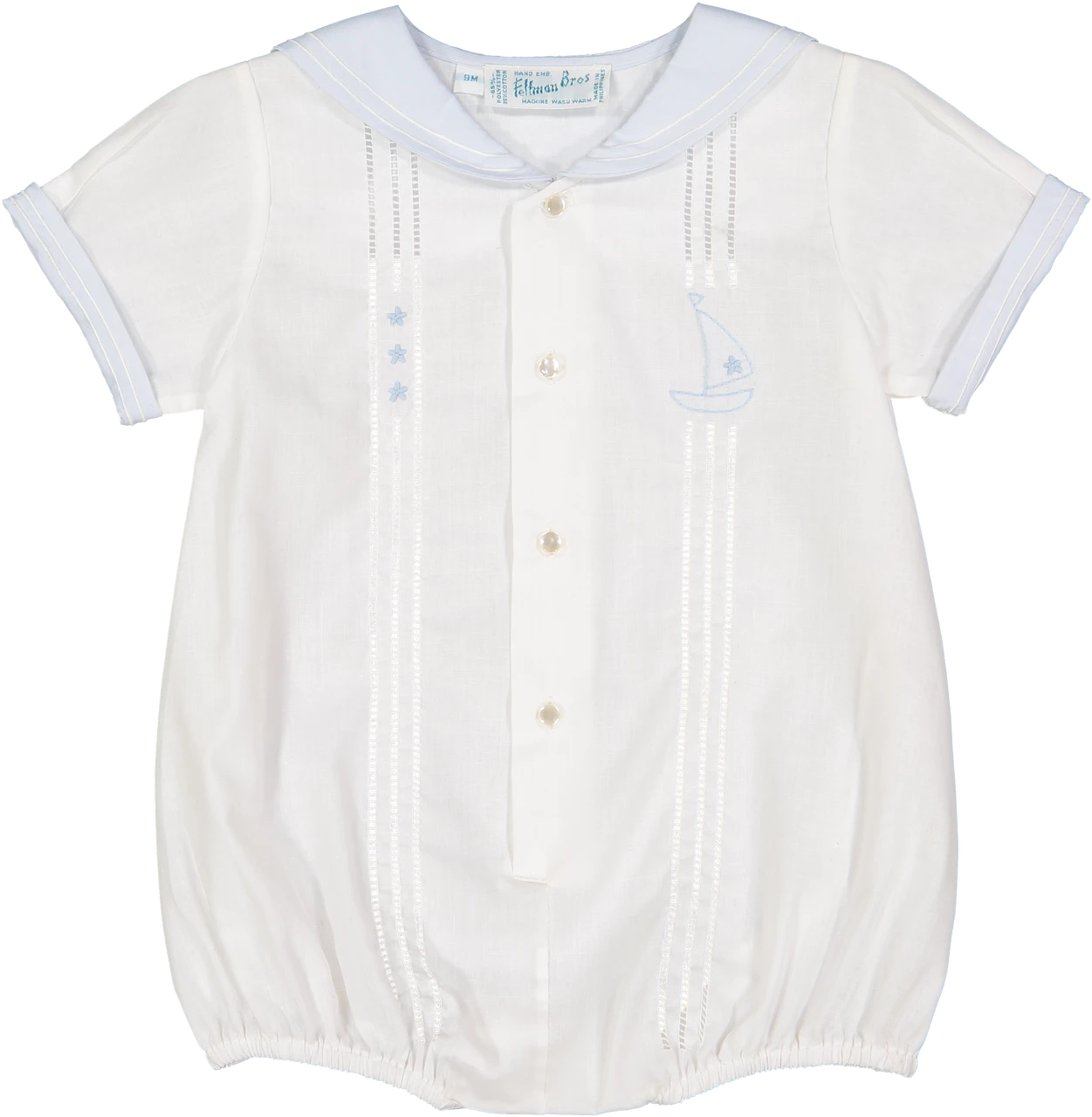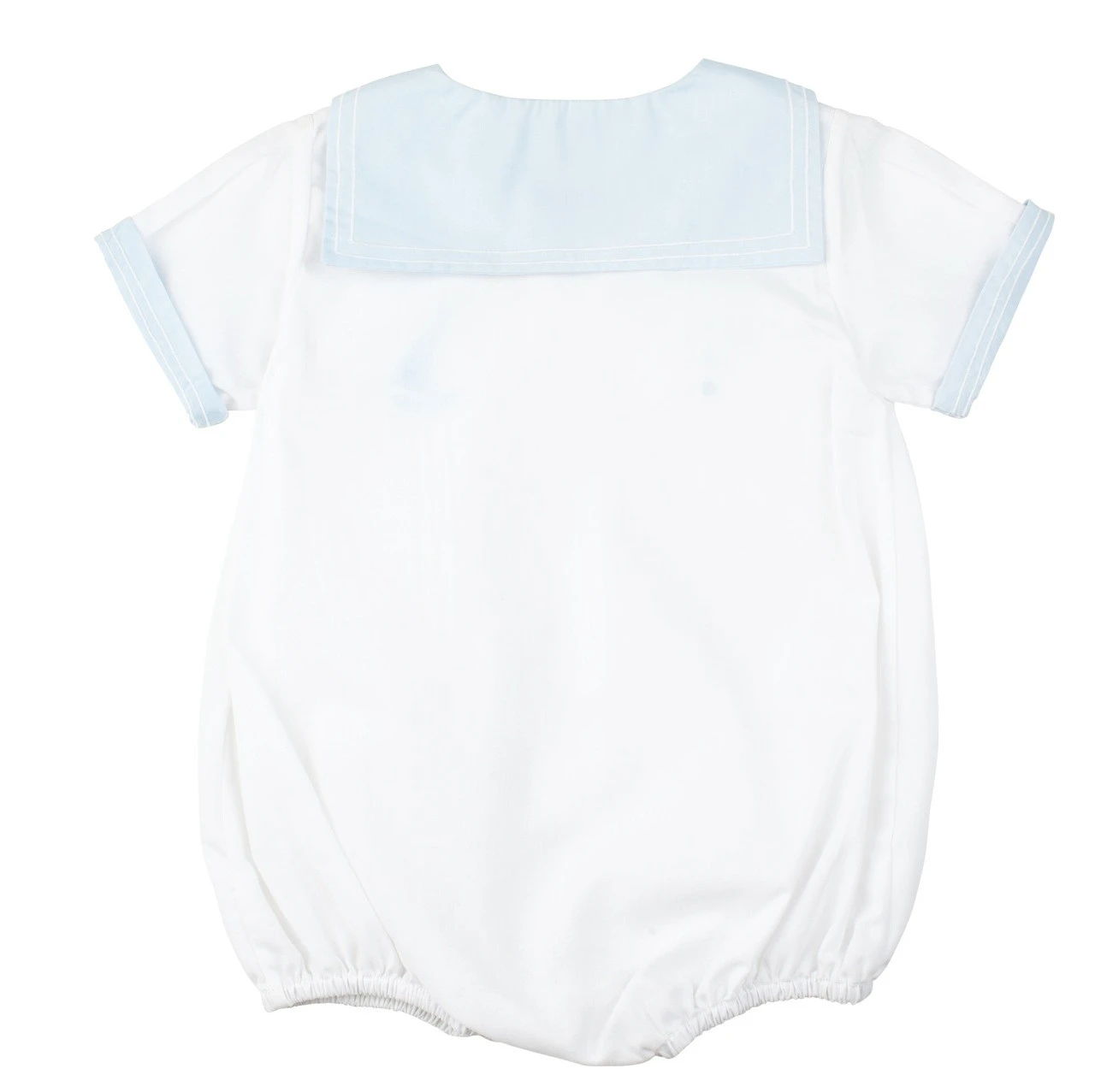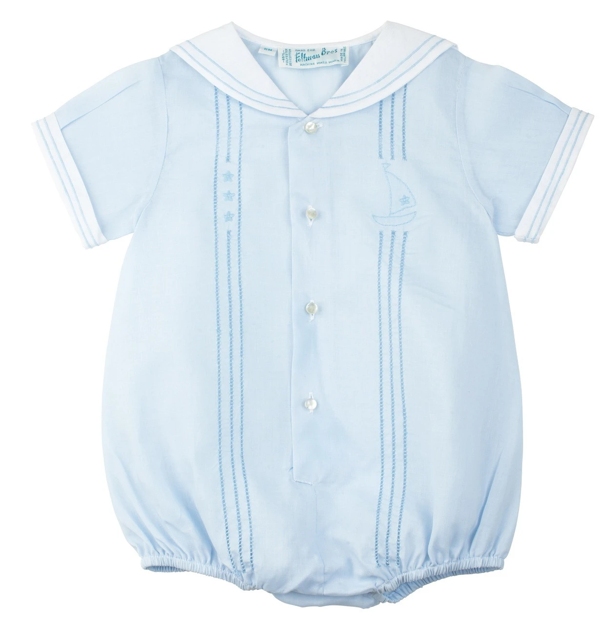 Who isn’t in love with nautical baby creepers? This baby boy outfit is cute, classy, and full of nautical details! Features a sailor collar that folds over the back and matching detailing on the sleeve cuffs. The button down front is accented with rows of boring and sweet hand made embroidery of a sailboat and stars. Opens with buttons down the front and snaps at the crotch for easy on-and-off changing convenience. A creeper so adorable and convenient, how can you say no?