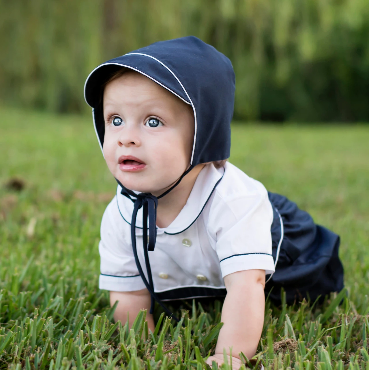 Have you met our new Navy Smocked Collection? They’re our newest Feltman Brothers additions that are as classy as can be! This baby boys bonnet is the perfect accessory to pair with the Smocked Bib Overall Set. Navy smocking with white hand-embroidery – what says “handsome” more than that?! (Looking for a little girl outfit? Check out the matching Navy Smocked Flutter Sleeve Dress and Romper – they’re absolutely beautiful.)