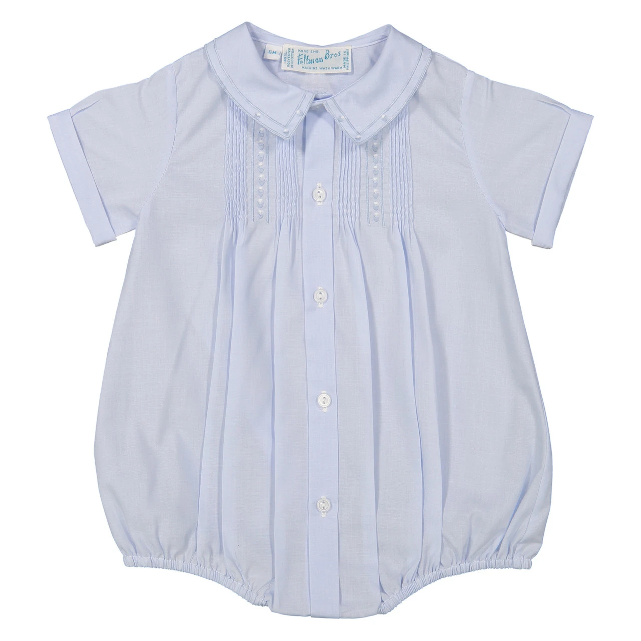 This is the heirloom infant romper that Grandpa wore, Dad wore and now the newest member of the family will also wear and enjoy. This baby boy, infant bubble has such fine detailing and intricate embroidery. The peter pan collar has embroidery trim. Take a closer look at the front yolk of the baby creeper and you’ll see the lovely half moon embroidery design with the fine pintucks. Button front opening gives the romper a decorative touch and makes dressing your baby really easy, plus snap closure by the crotch which makes changing your baby quick and easy.