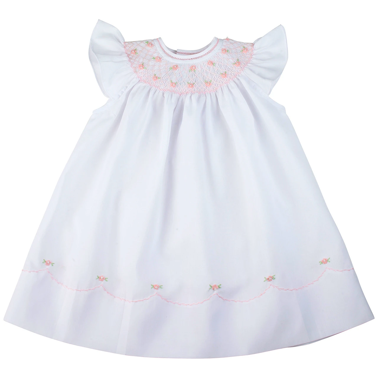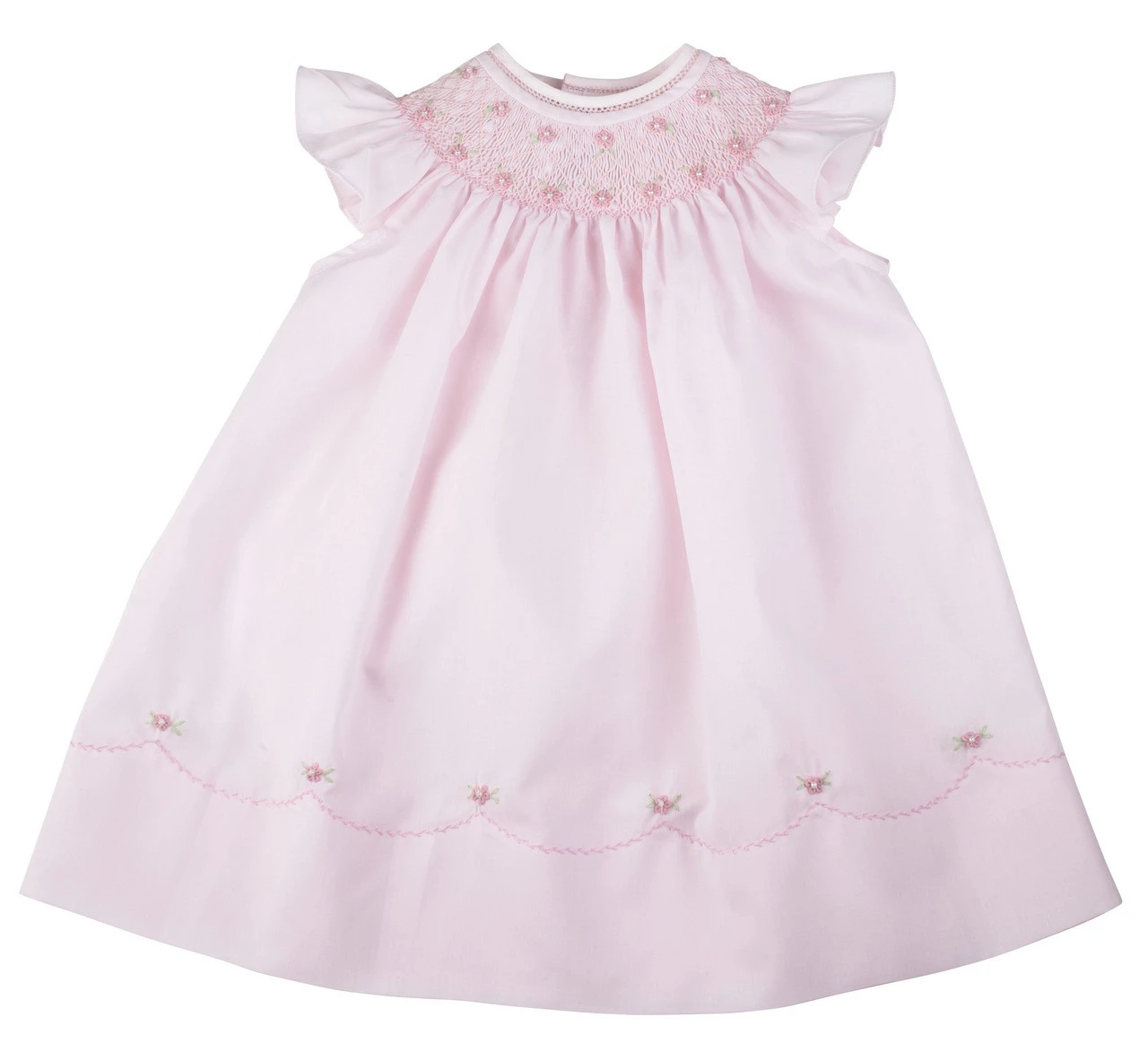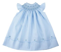 A charming bishop dress for girls with smocking, embroidery, and fly sleeves – what could be sweeter? Dainty fagoting lines the neck of this dress, followed by a smocked yoke, covered in a beautiful hand embroidered diamond design, embellished with tiny floral bullions with pearls in the center. Matching flower bullions adorn the hem, just above a soft scallop shaped feather stitch. The intricate details, soft colors, and sweet fly sleeves make it the perfect choice for any occasion – be it Easter, outings at the park, or days spent with family and friends. Another Feltman Brothers classic – sure to become a treasured family heirloom for generations!