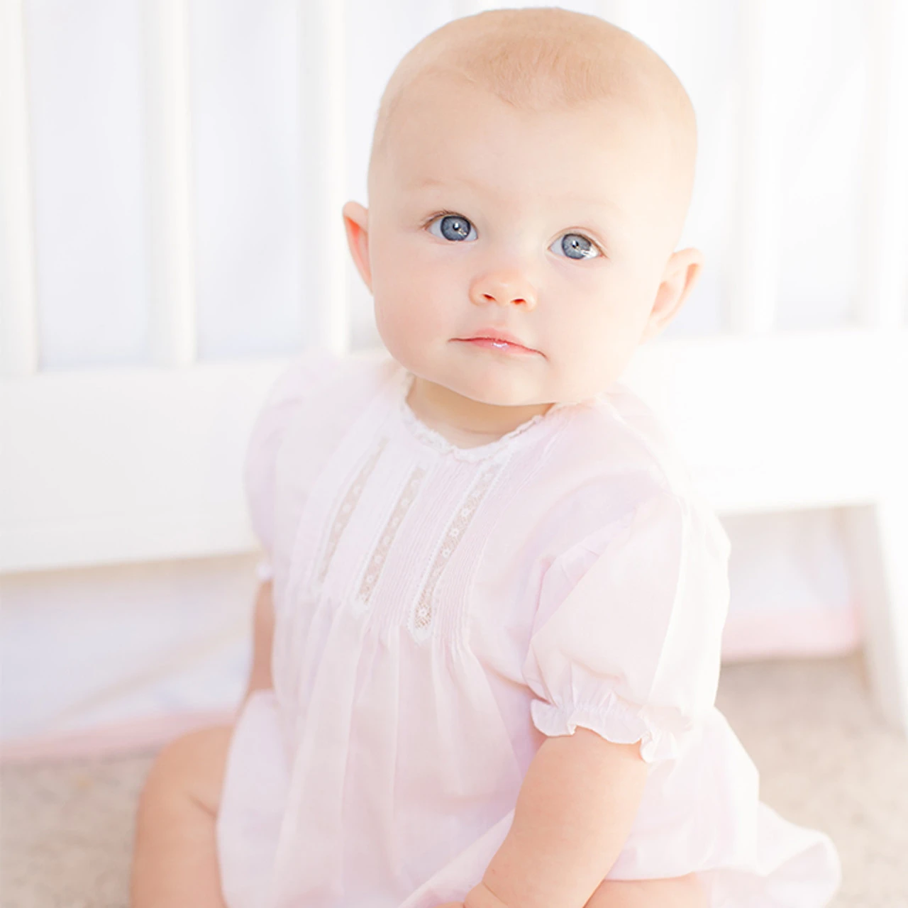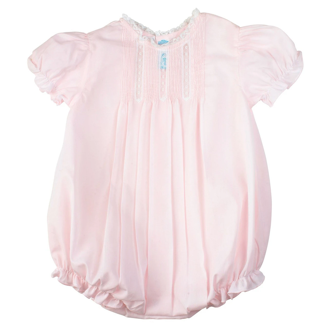 Babies are a precious gift from heaven, pure and angelic. This soft and classy bubble is just the right thing for your little angel to wear on special occasions, holidays, or every day! Elegant French lace graces the neck as well as the bodice, between dainty hand stitched pintucks, opening into soft gathered pleats down the remainder of the piece. Elastic ruffles edge the puffed sleeves and leg holes of this classy, precious bubble. A vintage style outfit for your beautiful baby girl, an heirloom to cherish for years to come.