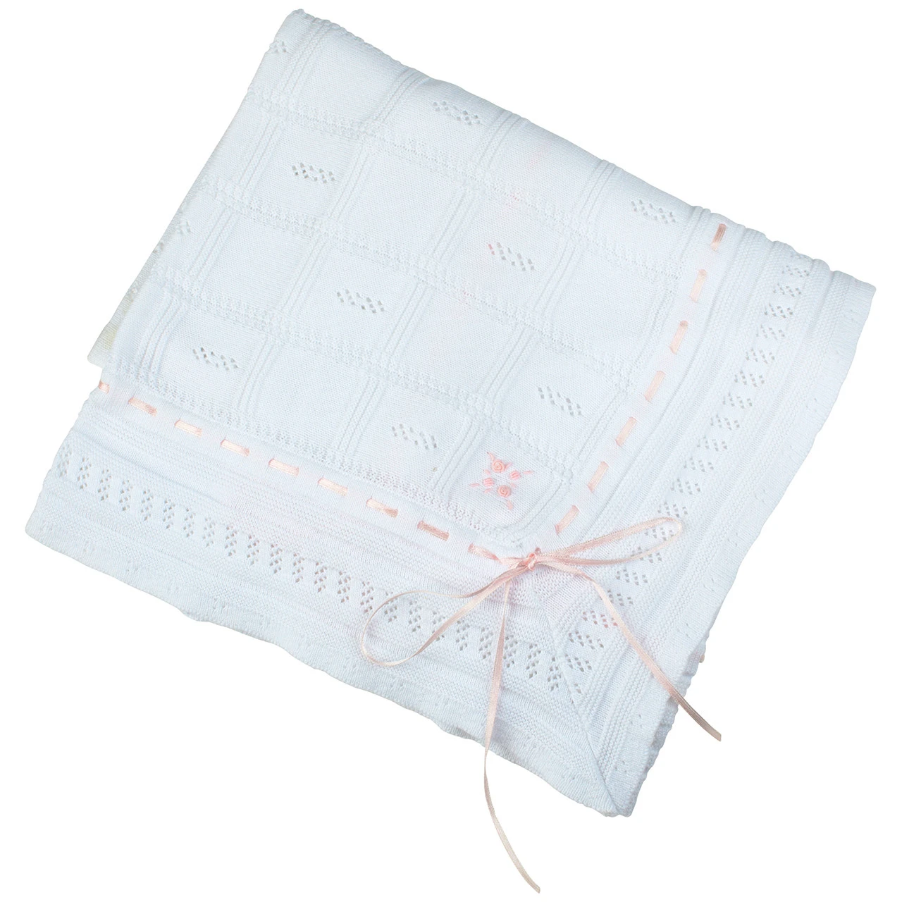 Wrap your little one in luxury with this magnificent baby blanket. This soft cotton baby blanket is perfect for swaddling, snuggling, and draping over a stroller. Beautifully made with pointelle knit designs and with a satin ribbon woven through and tied in a dainty bow at the corner. A sweet accessory for your baby, with the timeless quality and style you’ve come to expect from Feltman Brothers!