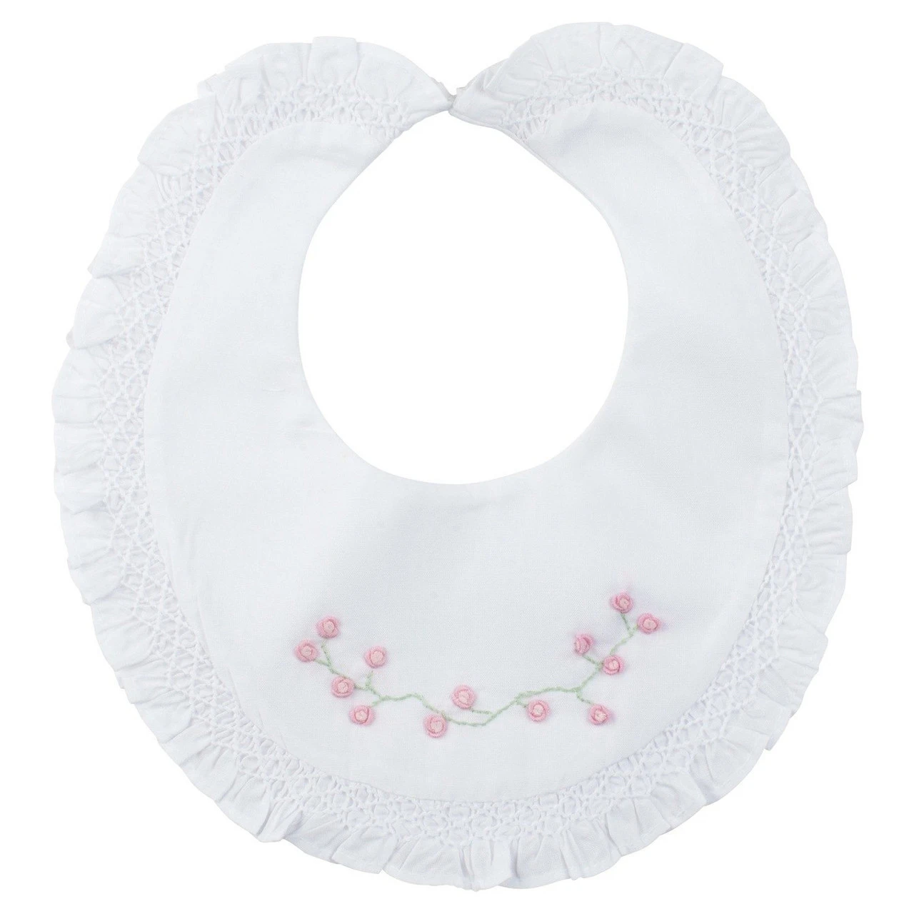 Classy and cute, just like your little one! This sweet baby girl bib is the perfect matching accessory to so many of her Feltman Brothers outfits. Available in either soft white or pastel pink, with beautiful rosebud bullions on the center. Lovely smocking edges this piece with a hand embroidered diamond design, and ends in sweet little ruffles all along the edges. Perfect for protecting her dainty baby clothing, or as a fashion accessory in itself. Works great as a gift too!