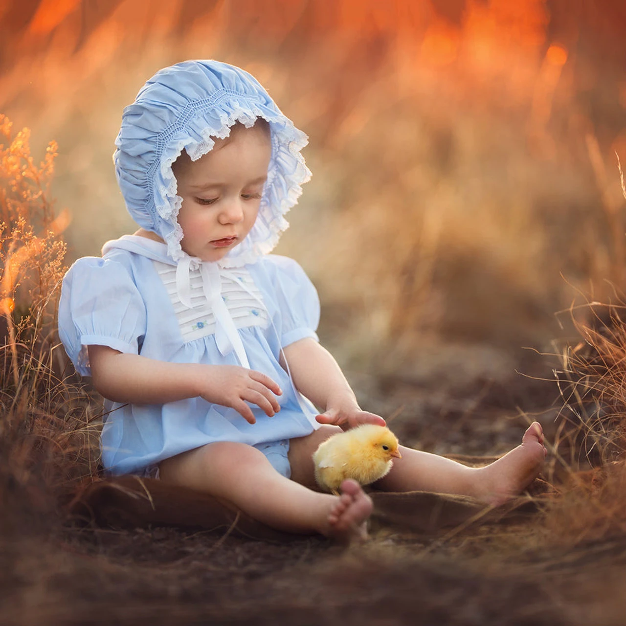 Available in either blue or pink, with a white rounded collar and piping on the edges. Features a white bib insert with horizontal pintucks and beautiful hand embroidered flower bullions. Tiny gathered pleats continue down the bubble until the snaps and elastic leg holes at the bottom. Meet a timeless, vintage baby outfit from Feltman Brothers – sure to become a family heirloom for generations to come!