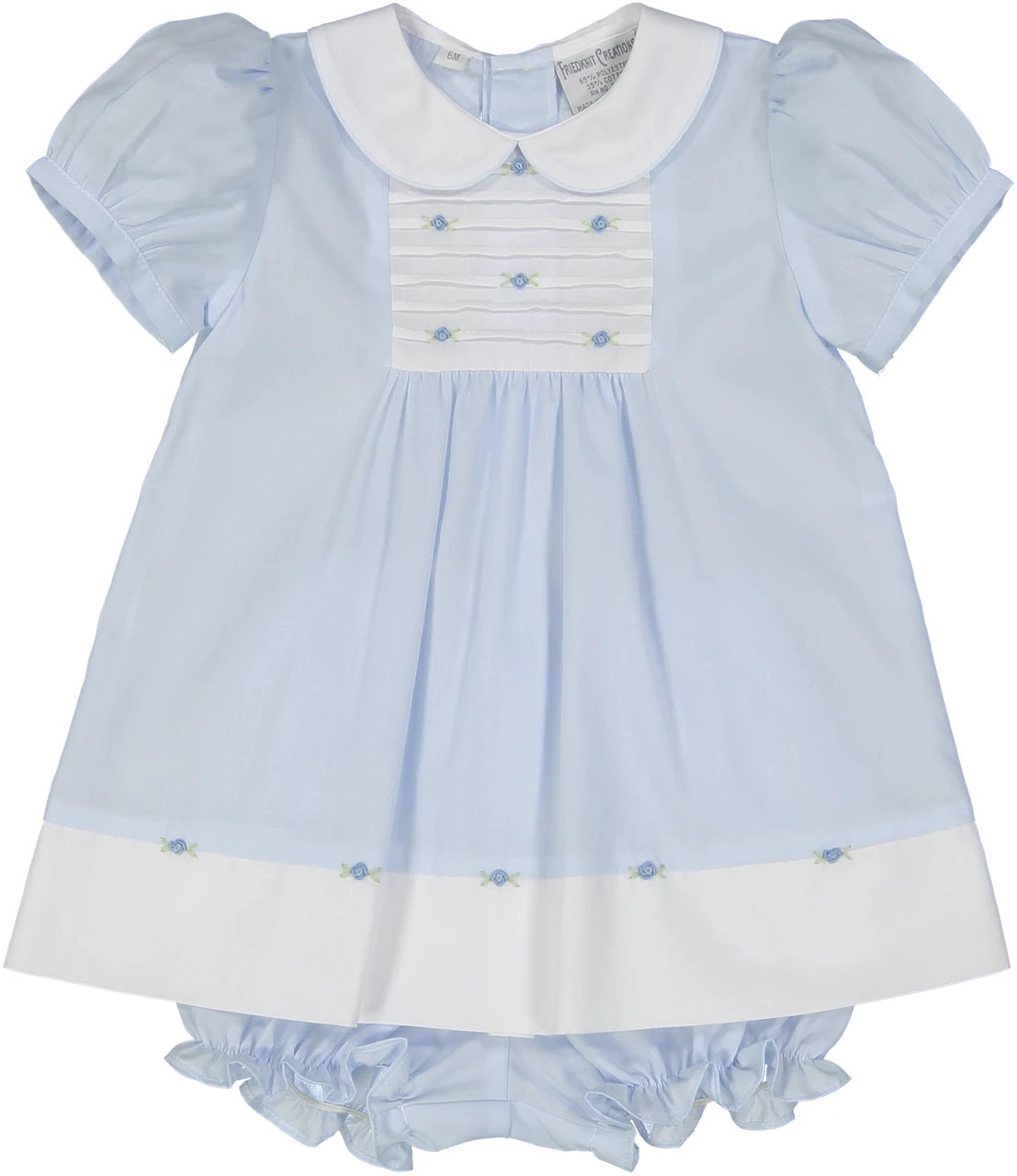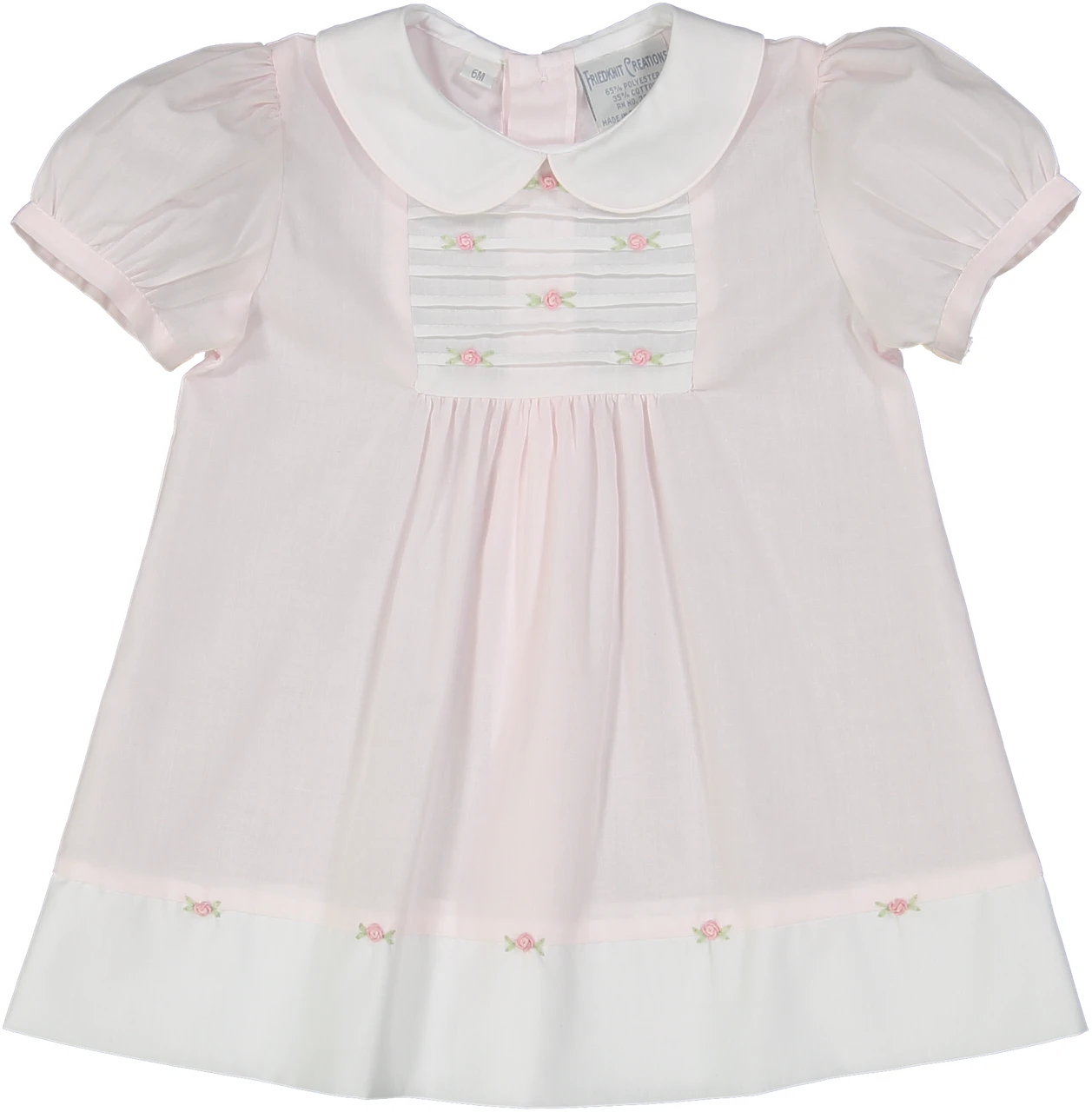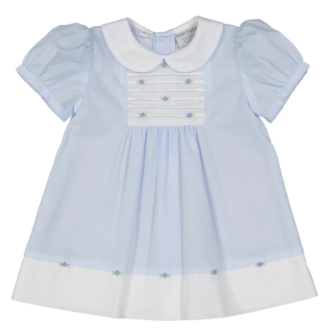 Available in soft blue or pink, with a white rounded collar and piping on the edges. Features a white bib insert with horizontal pintucks and beautiful hand embroidered flower bullions. Tiny gathered pleats continue down the dress until the white hem panel embellished with floral bullions. A truly classy piece for your little princess for Easter, family portraits, and any formal occasion!