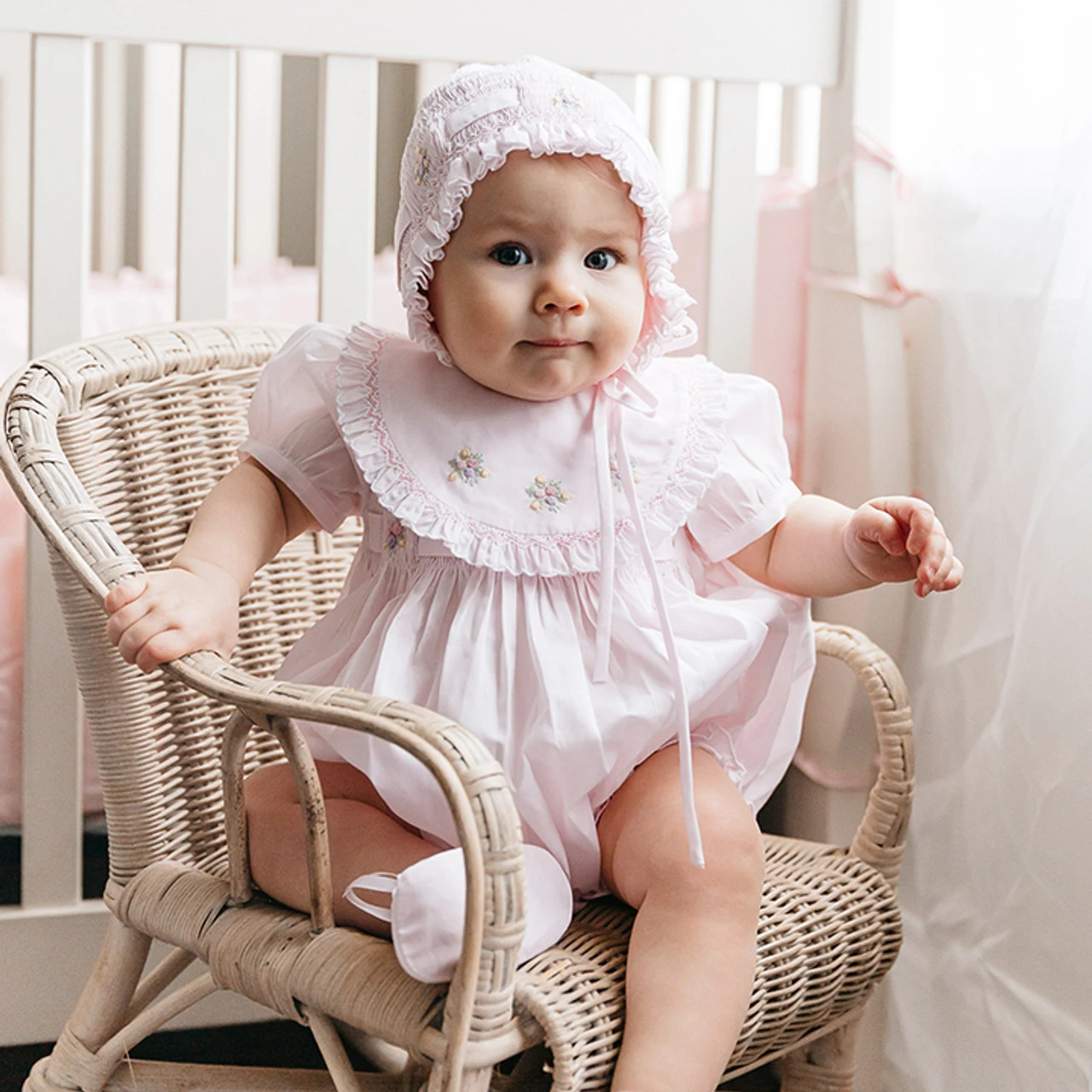 - Matches the Secret Garden Collection, featuring fluted lace trim, chevron embroidery, and rosebud bullions.