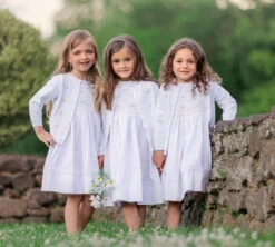 - Handmade details include a chevron smocked bodice with a scalloped ruffle collar, rosebud bullions, and basket weave ribbon
