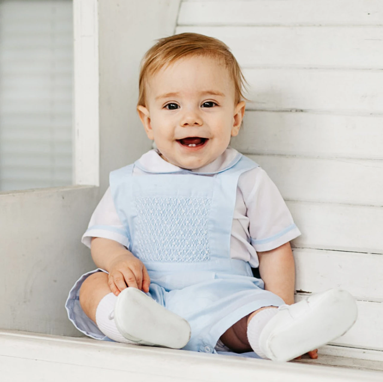 Little boys in smocked outfits – can it get any cuter? This classy two-piece set comes in timeless navy and baby blue, with vintage style smocking, delicate hand embroidery, and detailed edging along the collar and cuffs. The Smocked Bib Overall Set is the perfect elegant outfit for your little man – he’ll be the star of any show!Â