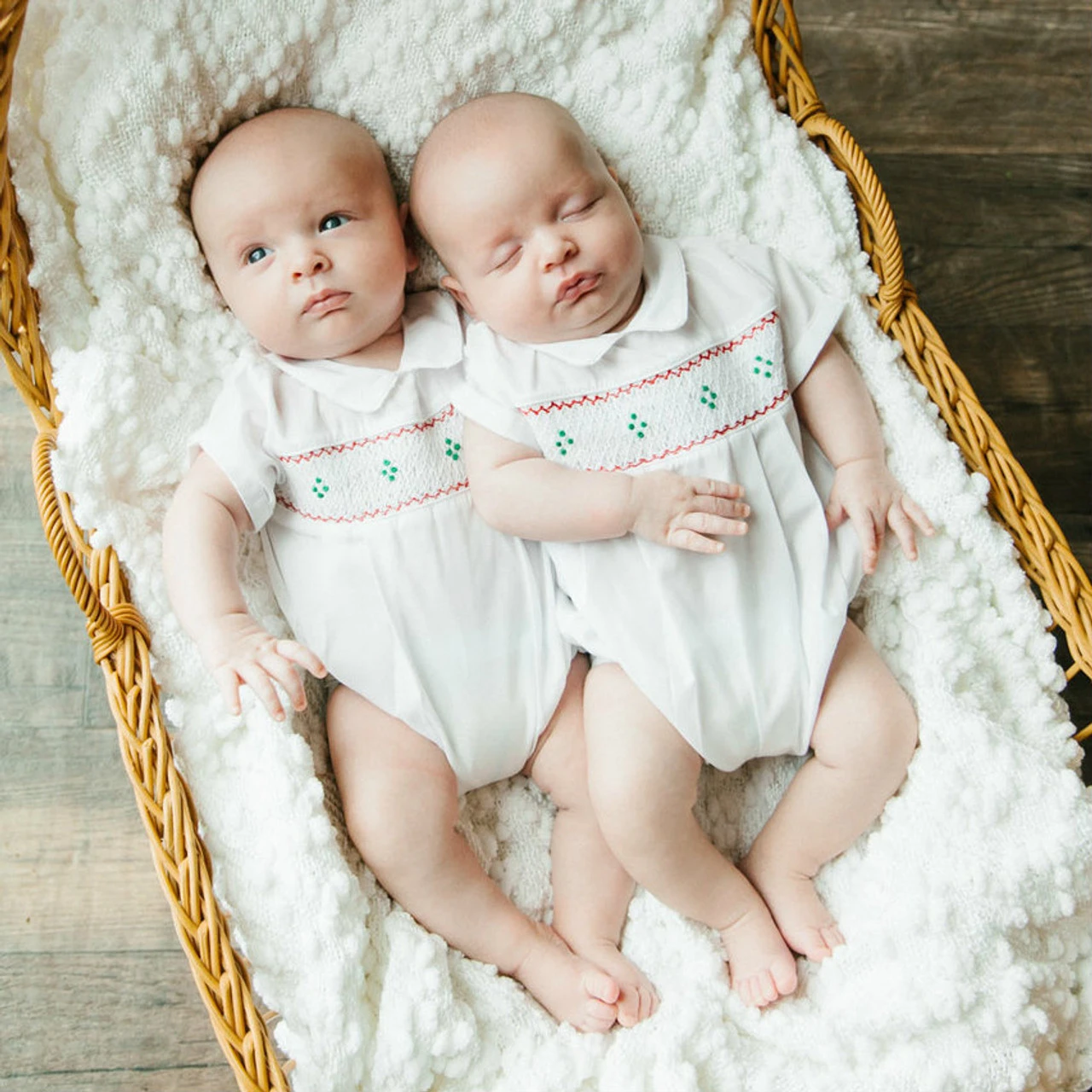 Tis the season once again – want your little one to shine? Try the Smocked Holiday Creeper, another favorite from Feltman Brothers. Featuring a soft white color, classy collar and cuffs, and sharp pleats down the front. The bodice holds a lovely smocked insert covered in hand embroidered details in the traditional holiday colors. A classy and elegant holiday creeper – buy now, have an heirloom forever!