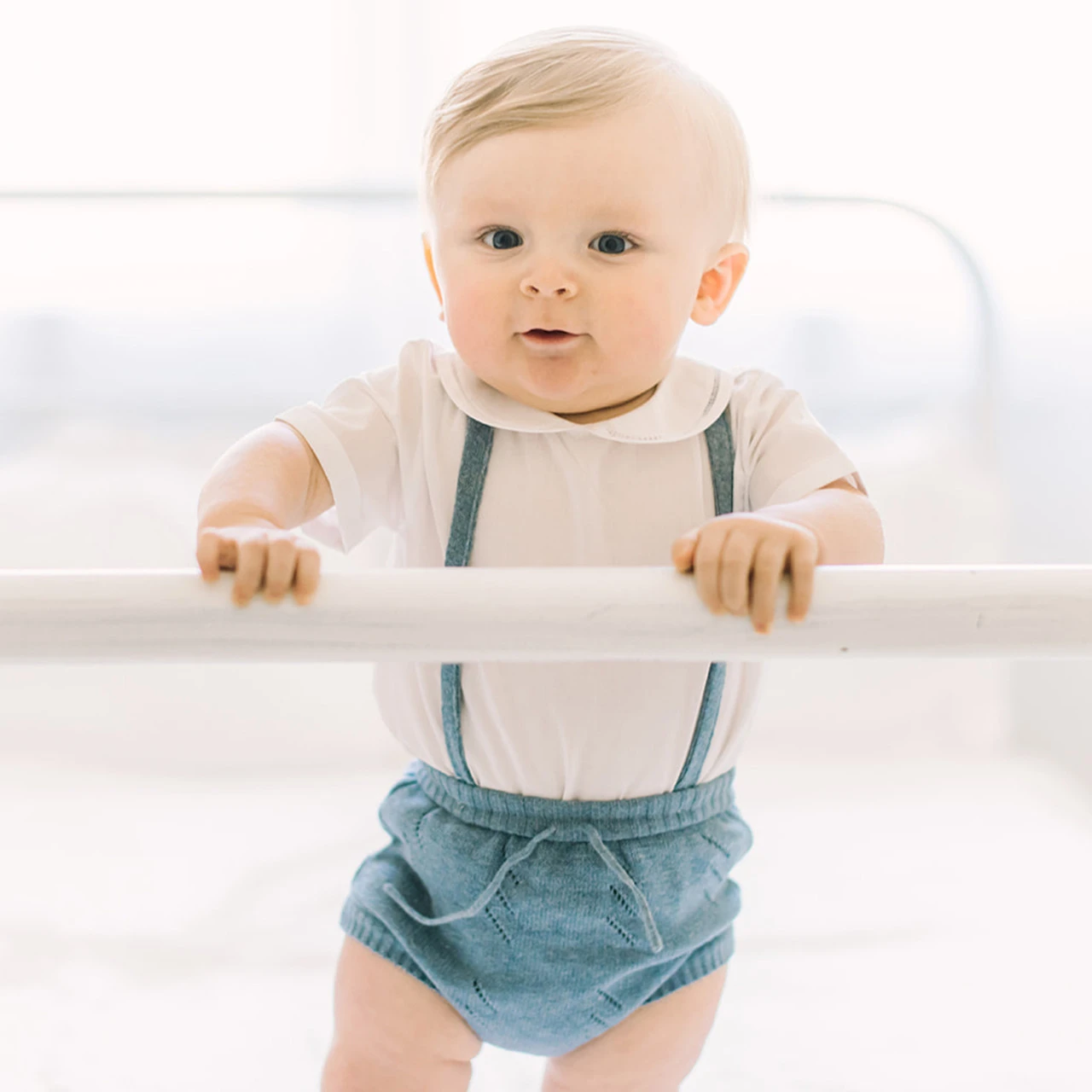 This adorable outfit comes in baby blue or heather blue with a pointelle design and a dainty bow at the waist.