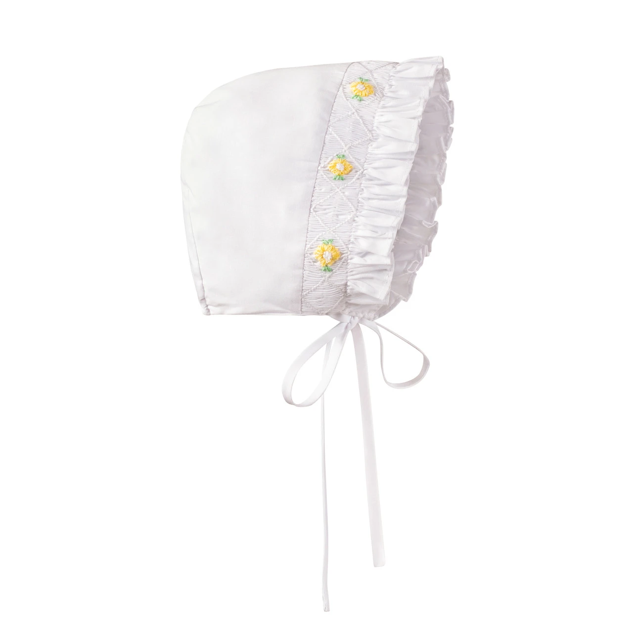 Love the Daisy Romper or Dress, and want to complete the look? Pair with this adorable bonnet, made with the same hand-embroidered daisy bullions and smocking and you’ve got the complete look!