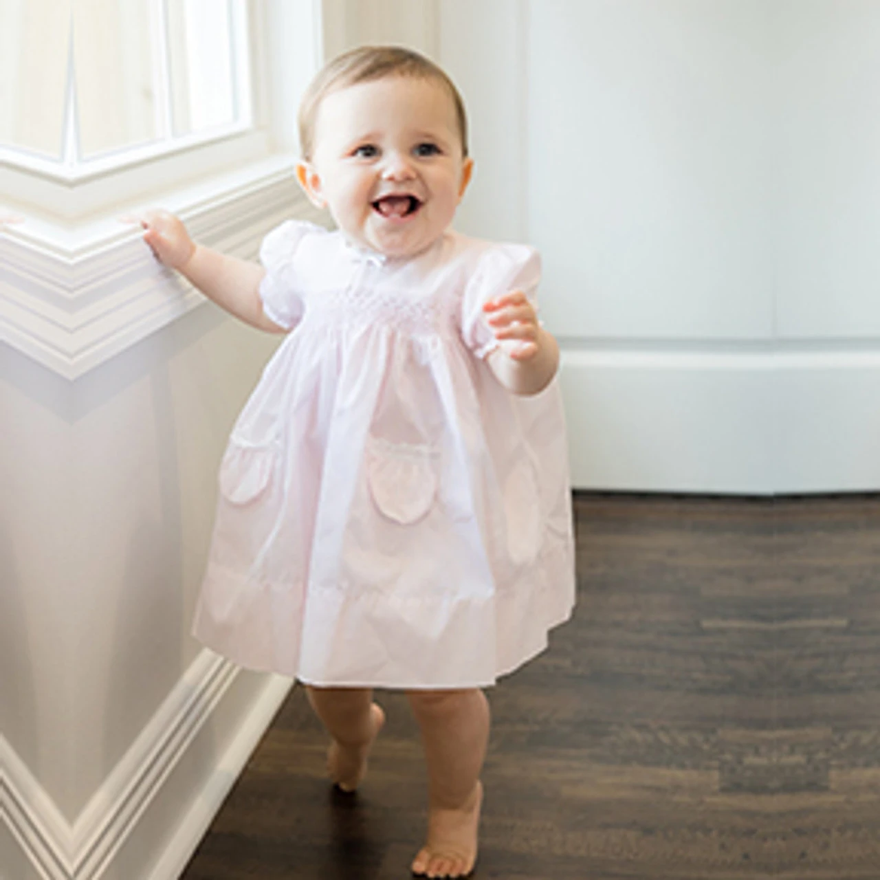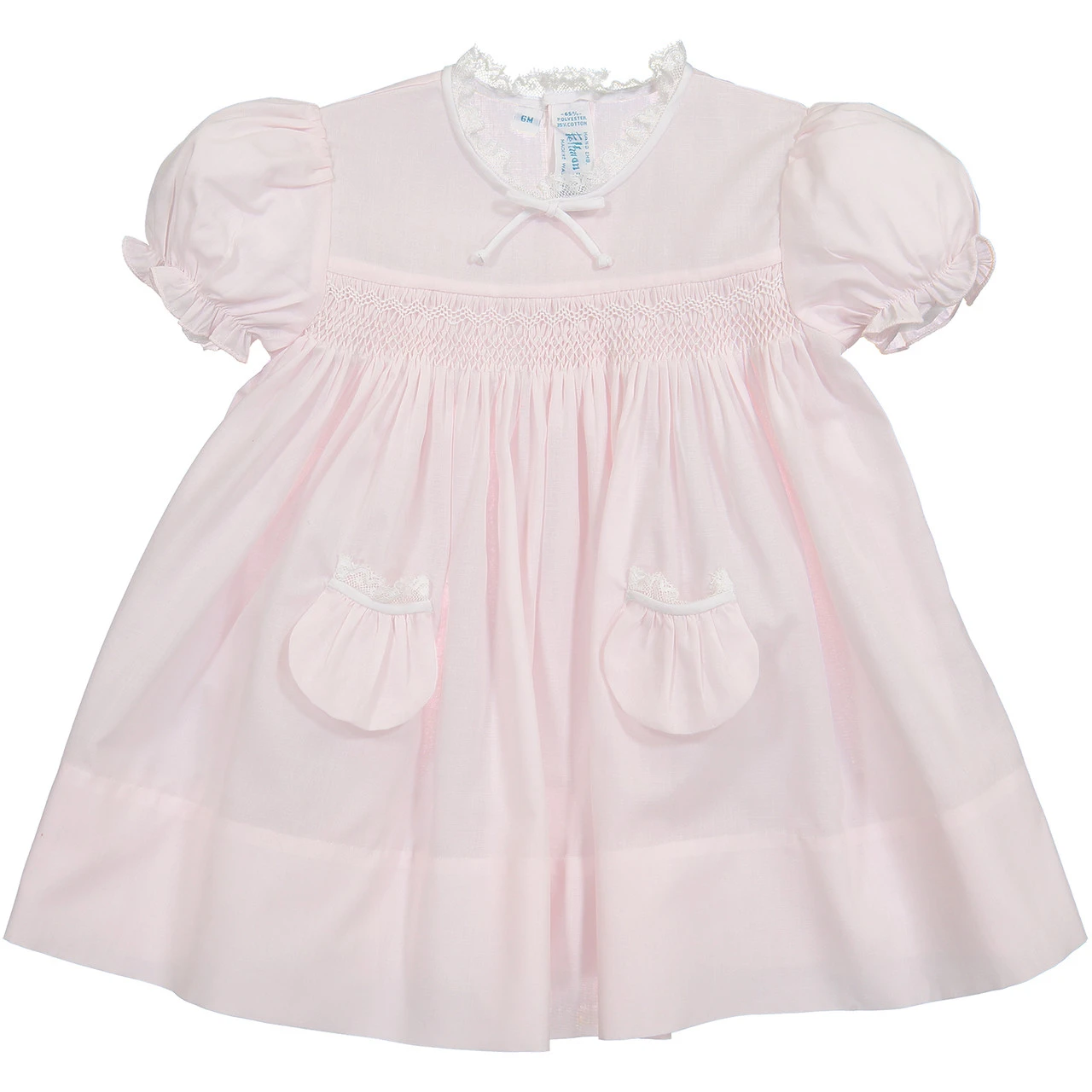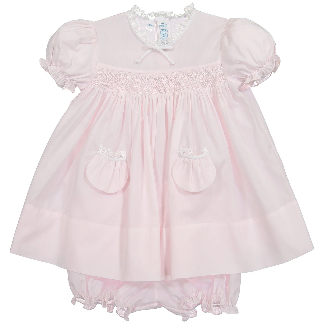 This heirloom inspired dress is made with the most beautiful fluted lace, hand-stitched smocking, and sweet little pockets. Includes panties.