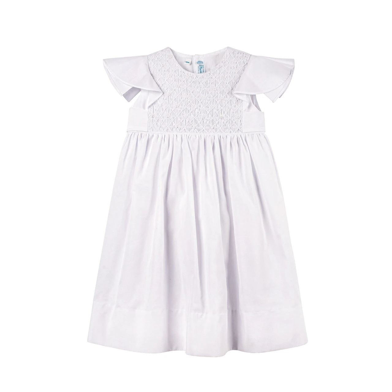 Looking for a wedding outfit for your little girl? This elegant, classic wedding dress is perfect for flower girls, family of the bride and groom, or any wedding guest who needs to look their best! Made with elegant smocking and hand embroidery, fly sleeves, and a sash tying in the back. Available in sizes 12m up to 8y!