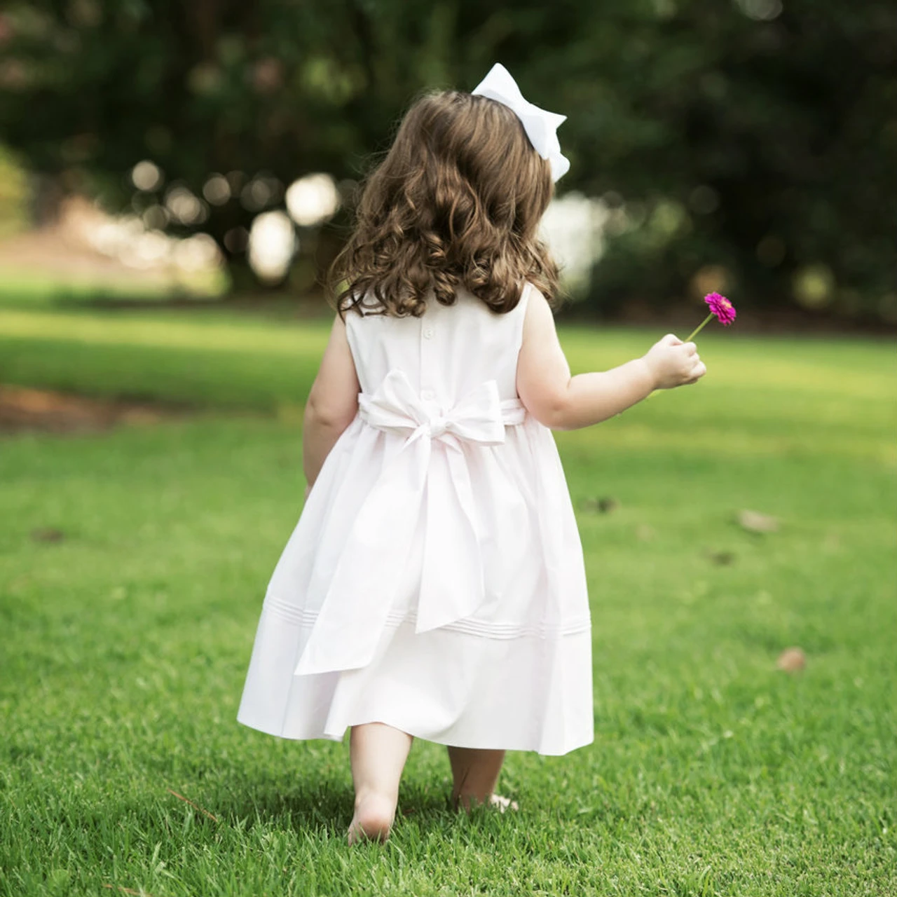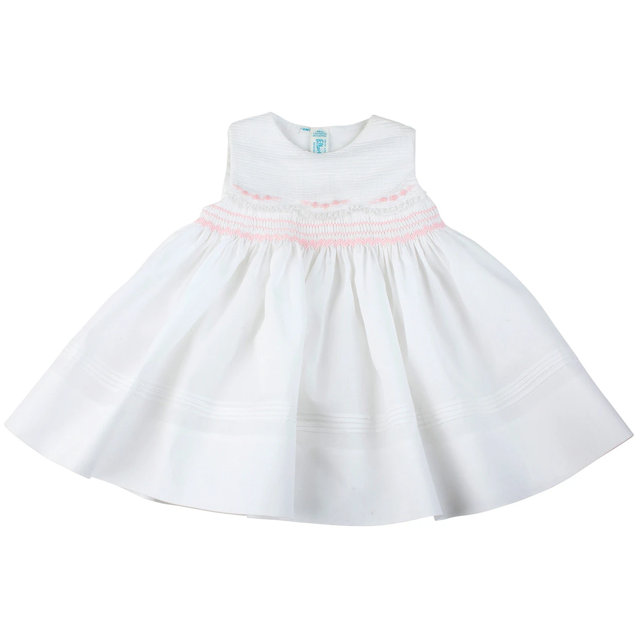 A little girls dress that is charming and so irresistible! This sweet sleeveless dress is available in classy white and pink colors and is breathtaking in either option. The bodice is made of sharp horizontal pintucks ending in delicate floral bullions and a row of scallop shaped lace. Beneath that lies a smocked waist, covered in dainty hand embroidery, going into soft gathered pleats until the horizontal pintucks lining the hem of the dress. This little masterpiece is perfect for Easter, Sunday wear, or everyday classy spring layette! Panty included in sizes 3M-9M (Bow belt is included only on dresses size 12M-24M & 2T-4T)